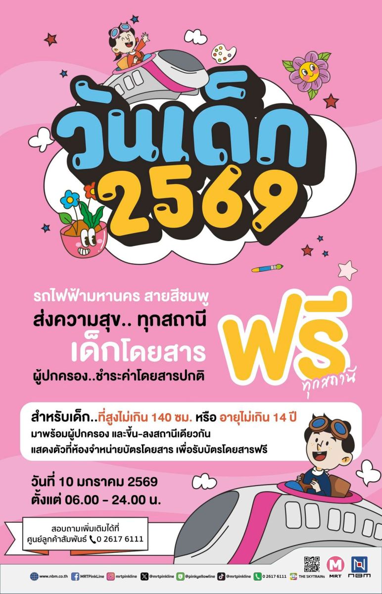 การรถไฟฟ้าขนส่งมวลชนแห่งประเทศไทย (รฟม.) ร่วมกับ บริษัท ทางด่วนและรถไฟฟ้ากรุงเทพ จำกัด (มหาชน) (BEM) ผู้ให้บริการเดินรถไฟฟ้ามหานคร สายเฉลิมรัชมงคล (MRT สายสีน้ำเงิน) และรถไฟฟ้ามหานคร สายฉลองรัชธรรม (MRT สายสีม่วง) บริษัท อีสเทิร์น บางกอกโมโนเรล จำกัด (EBM) ผู้ให้บริการเดินรถไฟฟ้ามหานคร สายนัคราพิพัฒน์ (MRT สายสีเหลือง) และบริษัท นอร์ทเทิร์น บางกอกโมโนเรล จำกัด (NBM) ผู้ให้บริการเดินรถไฟฟ้ามหานคร สายวิวัฒน์นคร (MRT สายสีชมพู) เตรียมส่งมอบความสุข พร้อมเสริมสร้างประสบการณ์ ในการใช้ระบบขนส่งสาธารณะทางรางให้แก่เด็กๆ เนื่องในวันเด็กแห่งชาติ ประจำปี 2569 ด้วยการโดยสารรถไฟฟ้ามหานคร ฟรี! ครบทั้ง 4 สาย ในวันเสาร์ที่ 10 มกราคม 2569 ตลอดระยะเวลาให้บริการ รายละเอียดดังนี้