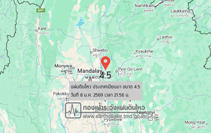 วันที่ 8 ม.ค. 2569 เวลา 21.56 น. กองเฝ้าระวังแผ่นดินไหว กรมอุตุนิยมวิทยา แจ้งเหตุ แผ่นดินไหว ขนาด 4.5 ความลึก 10 กม. ภายในพื้นที่ของประเทศเมียนมา (22.06°N,96.15°E) ศูนย์กลางห่างออกไปทางทิศตะวันตกเฉียงเหนือของ อ.ปางมะผ้า จ.แม่ฮ่องสอน ประมาณ 357 กม. ยังไม่มีรายงานผลกระทบต่อประเทศไทย