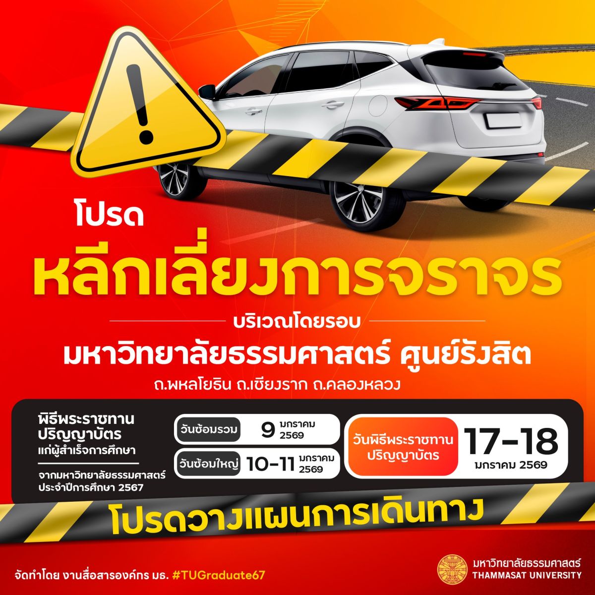 มหาวิทยาลัยธรรมศาสตร์ แจ้งข่าว ขอความร่วมมือหลีกเลี่ยงการจราจร บริเวณโดยรอบมหาวิทยาลัยธรรมศาสตร์ ศูนย์รังสิต เนื่องจากมีพิธีพระราชทานปริญญาบัตรแก่ผู้สำเร็จการศึกษาจากมหาวิทยาลัยธรรมศาสตร์ ประจำปีการศึกษา 2567 ณ อาคารกิติยาคาร มหาวิทยาลัยธรรมศาสตร์ ศูนย์รังสิต