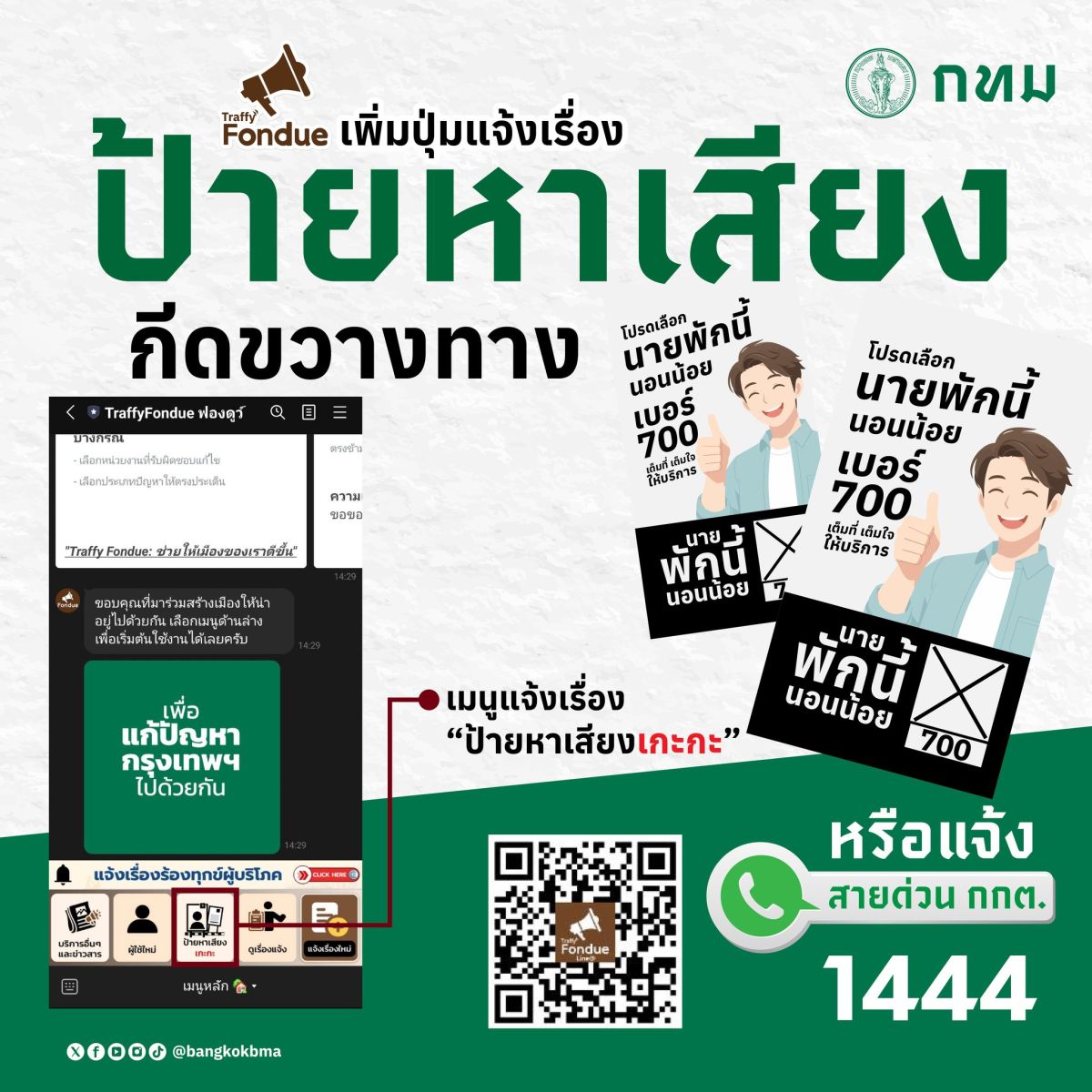 ผู้ว่าฯ ชัชชาติ กล่าวว่า กทม. ได้จัดทำแถบเมนูดังกล่าวเพื่อให้ประชาชนสามารถร้องเรียนกรณีพบป้ายหาเสียงที่ติดตั้งไม่เหมาะสม โดยหลักแล้วช่วงการหาเสียงสามารถติดตั้งป้ายได้ แต่ต้องไม่กีดขวางทางสาธารณะ ไม่ก่อความรำคาญ และไม่บดบังการจราจร ดังนั้น กทม. จึงเพิ่มเมนูเฉพาะเรื่อง “ป้ายหาเสียงเกะกะ” บน Traffy Fondue เพื่ออำนวยความสะดวกให้ประชาชนสามารถถ่ายภาพ ระบุพิกัด และแจ้งเหตุได้ทันที รวมถึงสามารถแจ้งผ่านสายด่วนสำนักงานคณะกรรมการการเลือกตั้ง (กกต.) หมายเลข 1444