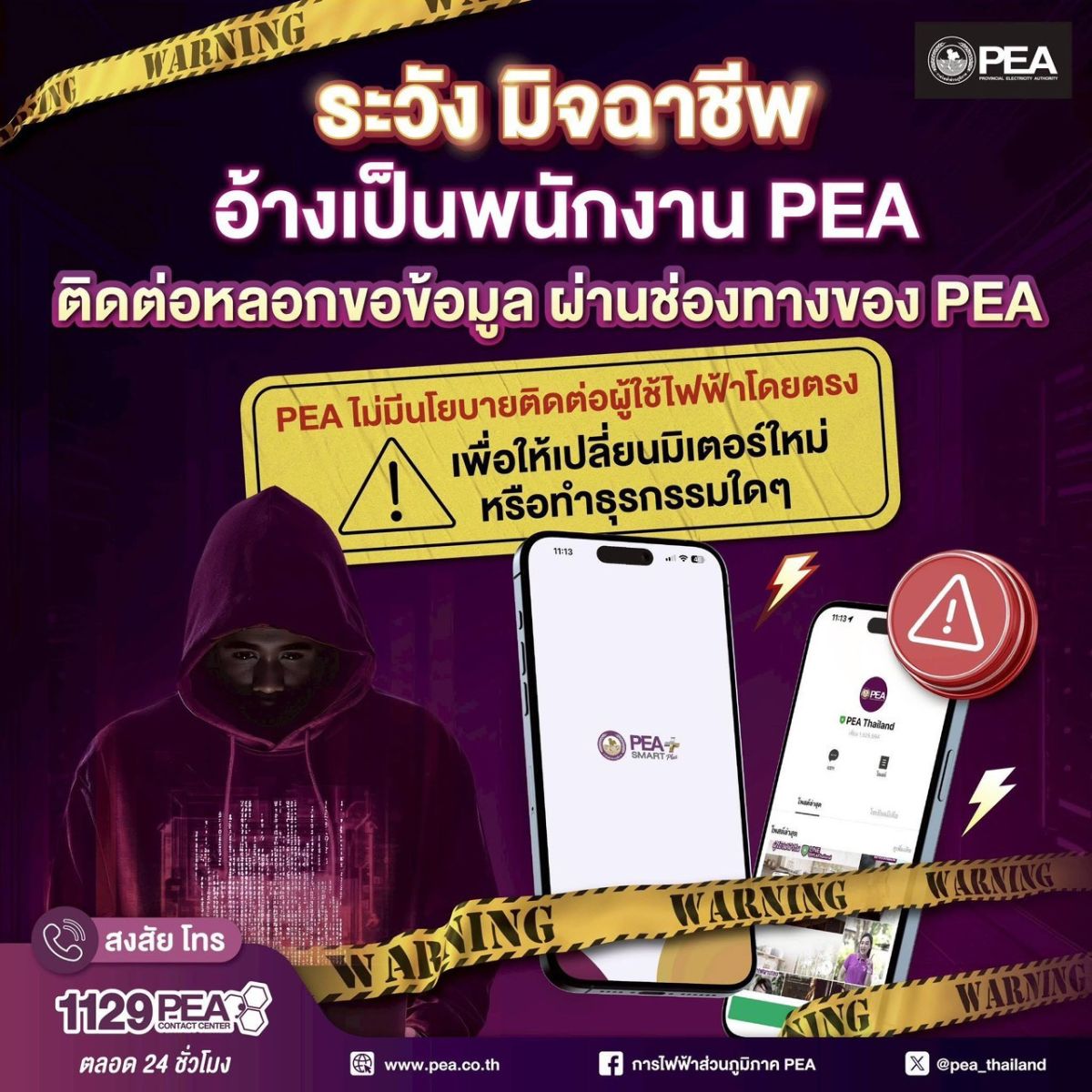PEA เตือนภัยมิจฉาชีพอ้างตัวเป็นพนักงาน PEA หลอกขอข้อมูลผ่านช่องทางของ PEA