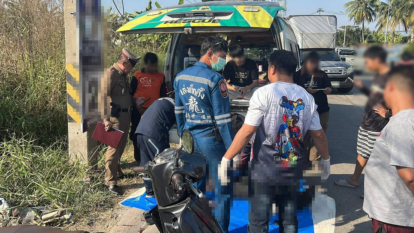 รถจักรยานยนต์เฉี่ยวชนกับรถกระบะส่งของ ก่อนเสียหลักพุ่งเข้าหาเสาไฟฟ้า ถนนเลียบคลองแคราย หนุ่มวัย 26 ปีเสียชีวิต จ.สมุทรสาคร