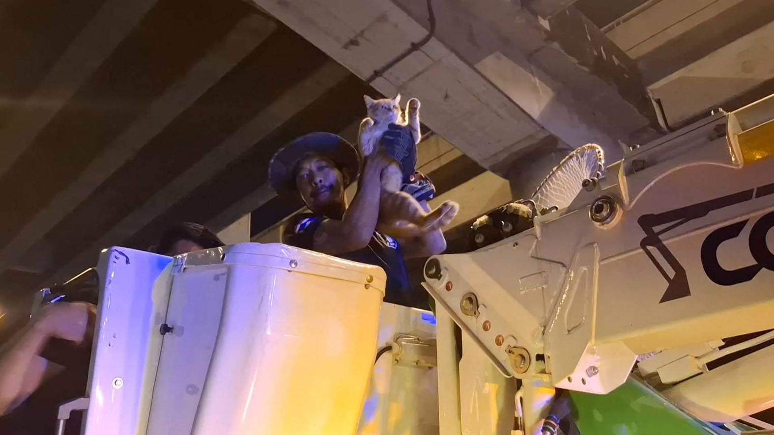 เจ้าหน้าที่ต้องปิดการจราจรช่องเลนกลางชั่วคราว เพื่อกางแขนรถกระเช้า โดยจัดกำลังเจ้าหน้าที่ 2 นาย พร้อมกระชอนขนาดใหญ่ ขึ้นไปยังบริเวณตอม่อสะพานที่แมวติดอยู่ ซึ่งเมื่อรถกระเช้าเข้าใกล้ พบว่าแมวมีท่าทีรับรู้ว่ามีคนมาช่วย และได้กระโดดเข้ากระชอนเอง ท่ามกลางเสียงปรบมือและความดีใจของประชาชนที่ยืนเฝ้าดูการช่วยเหลือ โดยใช้เวลาประมาณ 30 นาที จึงสามารถนำแมวลงมาได้อย่างปลอดภัย