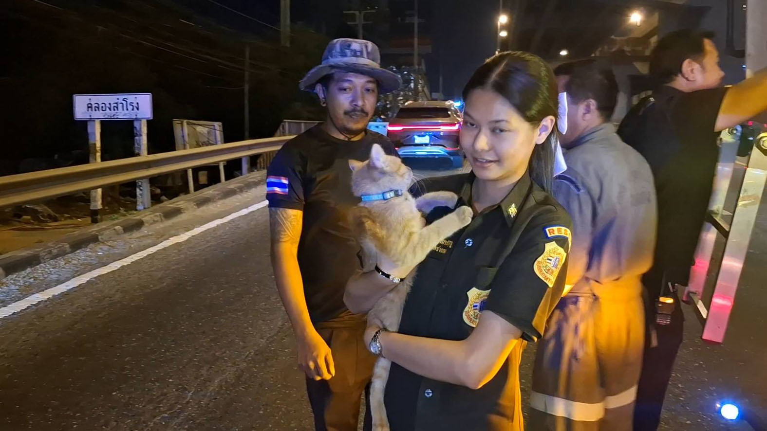 จากการสอบถาม เจ้าหน้าที่บรรเทาเทศบาลด่านสำโรง ให้ข้อมูลว่า ตนเองได้รับแจ้งว่ามี น้องแมว ติดอยู่ที่สูงบริเวณตอม่อสะพาน จึงจัดกำลังและรถบันไดขนาดเล็กมาตรวจสอบ ก็พบว่า น้องแมว ติดอยู่บริเวณตอม่อสะพานจึงเข้าเข้าช่วยเหลือน้องแมวลงมา โดยใช้เวลาประมาณ 30 นาที จึงนำ น้องแมว ลงมาได้