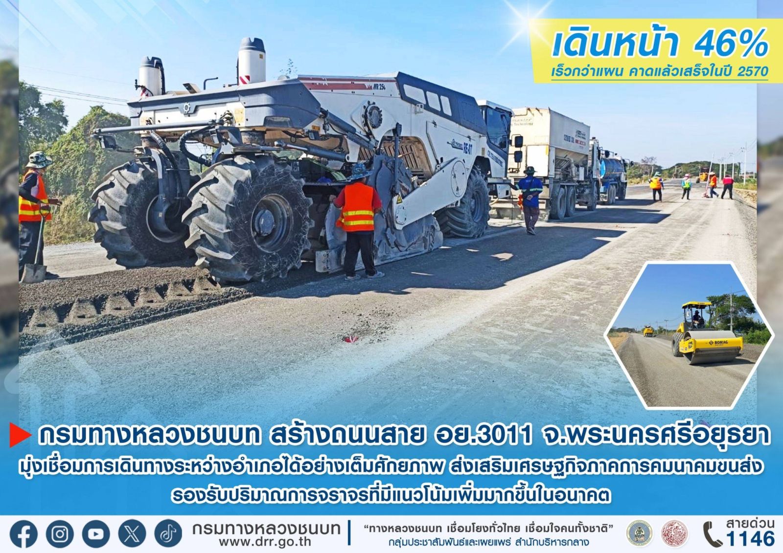 กรมทางหลวงชนบท สร้างถนนสาย อย.3011 จ.พระนครศรีอยุธยา เดินหน้า 46% เร็วกว่าแผน คาดแล้วเสร็จในปี 2570 มุ่งเชื่อมการเดินทางระหว่างอำเภอได้อย่างเต็มศักยภาพ ส่งเสริมเศรษฐกิจภาคการคมนาคมขนส่ง รองรับปริมาณการจราจรที่มีแนวโน้มเพิ่มมากขึ้นในอนาคต