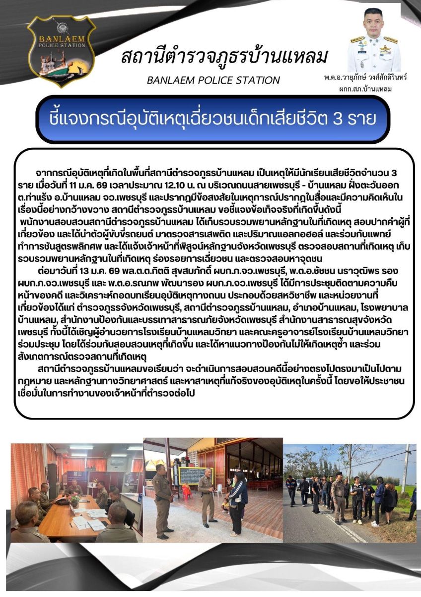 (13 ม.ค.69) พ.ต.อ.วายุภักษ์ วงศ์ศักดิรินทร์ ผู้กำกับการ สถานีตำรวจภูธรบ้านแหลม ออกมาชี้แจงกรณีอุบัติเหตุทางถนนที่มีนักเรียนเสียชีวิต 3 ราย