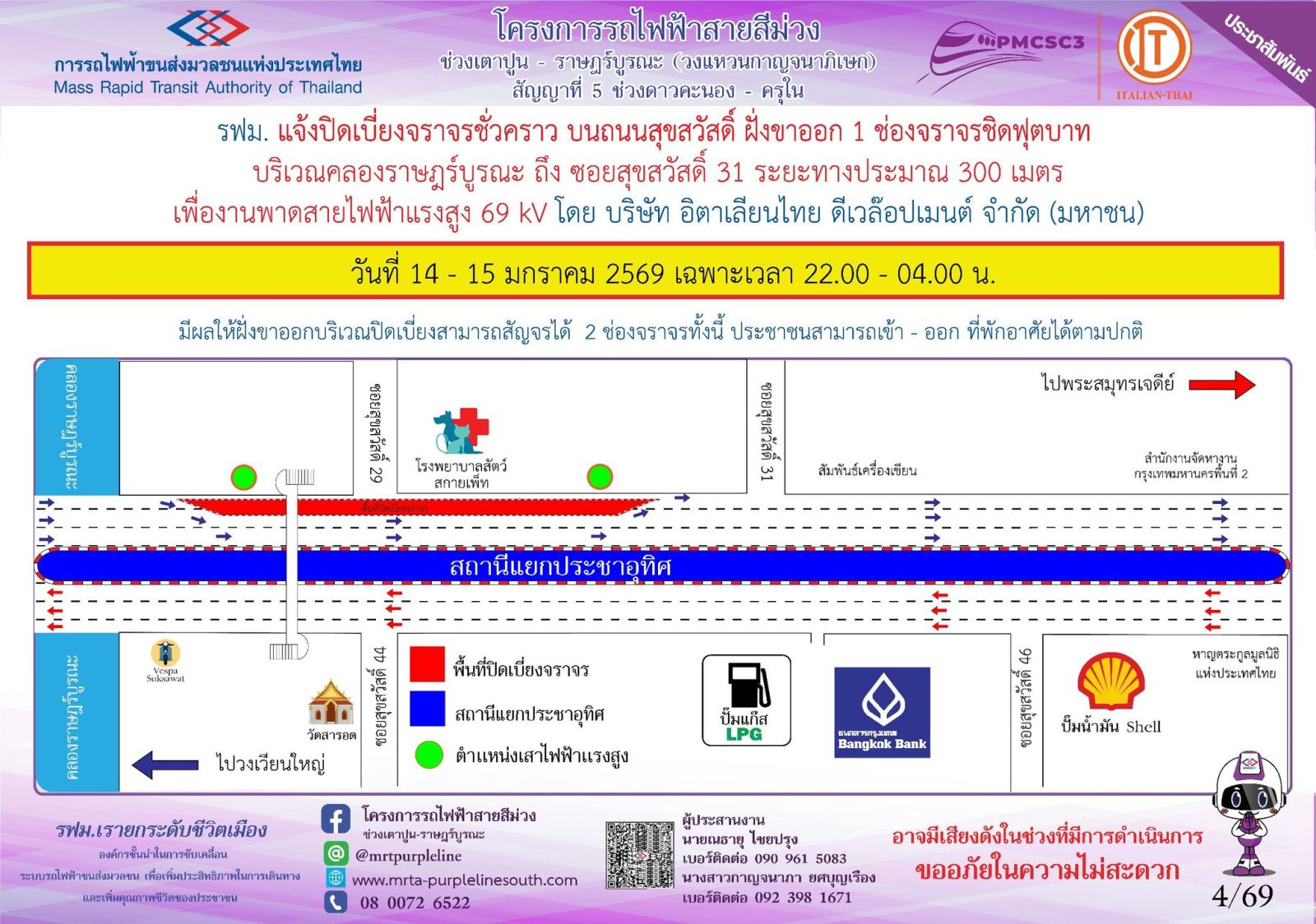 การรถไฟฟ้าขนส่งมวลชนแห่งประเทศไทย (รฟม.) แจ้งว่า บริษัท อิตาเลียนไทย ดีเวล๊อปเมนต์ จำกัด (มหาชน) ผู้รับจ้างงานก่อสร้างทางวิ่งและสถานียกระดับ อาคารจอดรถไฟฟ้าและอาคารจอดแล้วจร โครงการรถไฟฟ้าสายสีม่วง ช่วงเตาปูน - ราษฎร์บูรณะ (วงแหวนกาญจนาภิเษก) สัญญาที่ 5 ช่วงดาวคะนอง - ครุใน มีความจำเป็นต้องปิดเบี่ยงจราจรชั่วคราว บนถนนสุขสวัสดิ์ ฝั่งขาออก 1 ช่องจราจร ชิดฟุตบาท บริเวณคลองราษฎร์บูรณะ ถึง ซอยสุขสวัสดิ์ 31 ระยะทางประมาณ 300 เมตร เพื่องานพาดสายไฟฟ้าแรงสูง 69 kV ในวันที่ 14 - 15 มกราคม 2569 เฉพาะเวลา 22.00 - 04.00 น. โดยมีผลให้ถนนสุขสวัสดิ์ฝั่งขาออกบริเวณปิดเบี่ยงสามารถสัญจรได้ 2 ช่องจราจร ทั้งนี้ ประชาชนสามารถเข้า-ออก ที่พักอาศัยได้ตามปกติ