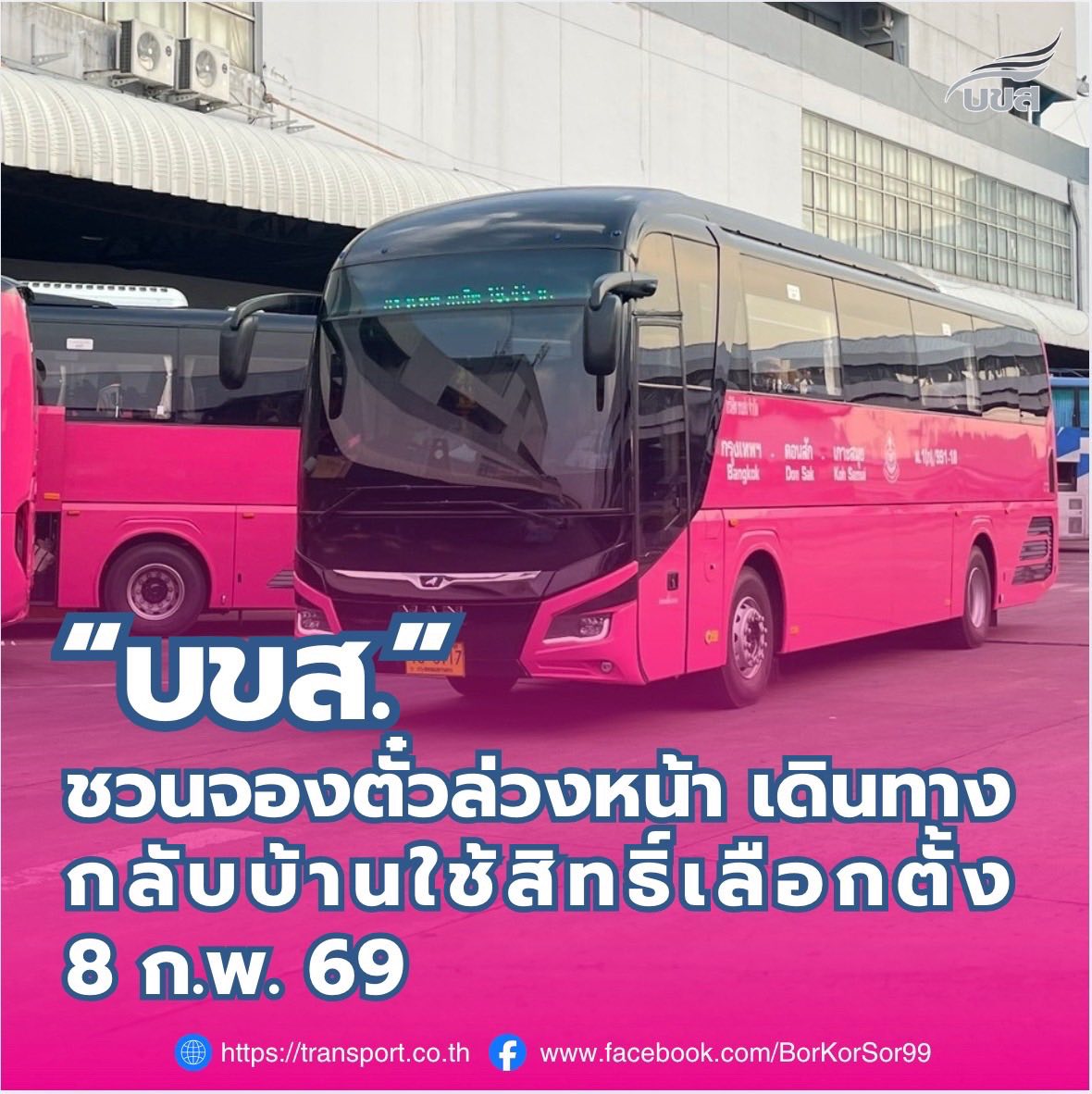 “บขส.” ชวนประชาชน จองตั๋วล่วงหน้าเพื่อเดินทางไปใช้สิทธิ์เลือกตั้ง 8 กุมภาพันธ์ 2569 เตรียมพร้อม รถโดยสาร - พนักงาน - สถานีขนส่ง อำนวยความสะดวก ปลอดภัยอย่างเต็มที่