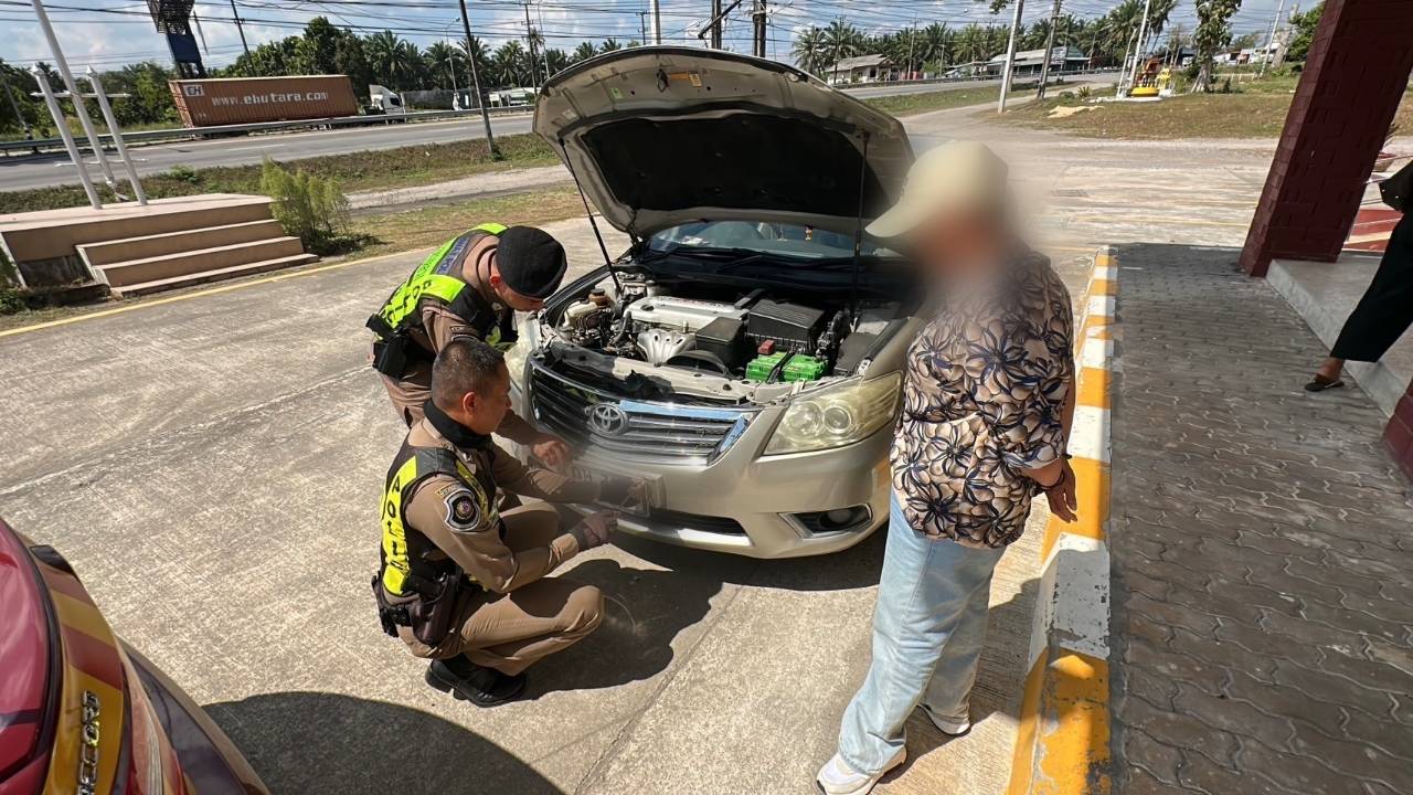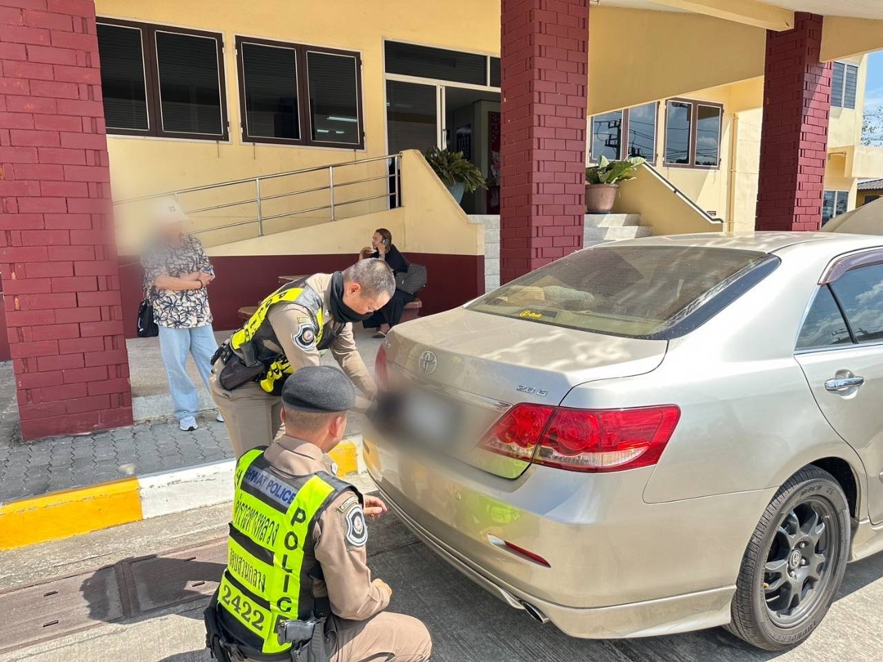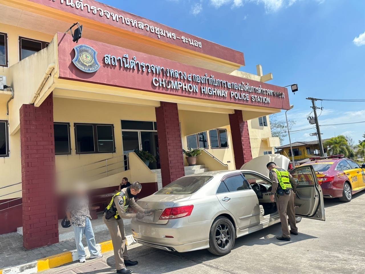 สืบเนื่องจากเจ้าหน้าที่ชุดจับกุม ส.ทล.4 กก.2 บก.ทล. ตั้งจุดตรวจกวดขันวินัยจราจรและป้องกันอาชญากรรม บน ทล.41 กม.23 (ขาล่องใต้) ต.วิสัยใต้ อ.สวี จ.ชุมพร ต่อมาเมื่อถึงเวลาประมาณ 10.00 น. พบรถยนต์ ยี่ห้อ TOYOTA สีบรอนทองทะเบียน จ. นครศรีธรรมราช ขับผ่านเข้ามายังจุดตรวจ ภายในรถยนต์มีผู้หญิงเป็นผู้ขับขี่และผู้โดยสาร และพบหมวกลักษณะคล้ายหมวกของเจ้าหน้าที่ตำรวจตั้งอยู่บริเวณคอนโซนหน้าของรถ เจ้าหน้าที่ชุดจับกุมจึงได้เรียกตรวจสอบให้เข้าชิดซ้ายในจุดที่ปลอดภัยเพื่อตรวจสอบ เนื่องจากพบแผ่นใบภาษีที่ติดมาบริเวณกระจกด้านซ้ายติดไว้มีลักษณะพิรุธ ต้องสงสัย ไม่ตรงกับที่ขนส่งออกมาให้ ต่อมาได้ น.ส.ดา (นามสมมุติ) อายุ 43 ปี แสดงตนเป็นผู้ขับขี่ เจ้าหน้าที่จึงได้ขอดูใบอนุญาตขับขี่และสอบถามเกี่ยวกับแผ่นป้ายภาษีที่ติดมา โดยได้ให้ น.ส.ดา (นามสมมุติ) อายุ 43 ปี แกะออกจากกระจกออกมาให้เจ้าหน้าที่ตรวจสอบ
