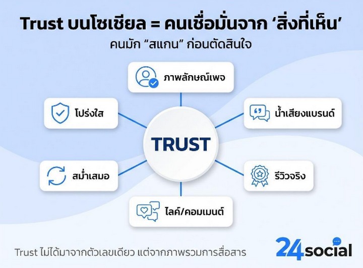 Trust บนโซเชียลมีเดีย คือความเชื่อมั่นที่ผู้บริโภคมีต่อแบรนด์หรือธุรกิจจากสิ่งที่มองเห็นและรับรู้บนแพลตฟอร์มออนไลน์ ไม่ว่าจะเป็นภาพลักษณ์ของเพจ น้ำเสียงการสื่อสาร รีวิวจากผู้ใช้งานจริง ไปจนถึงสัญญาณทางสังคมอย่างยอดไลค์ ยอดคอมเมนต์ หรือการมีส่วนร่วมต่าง ๆ ซึ่งในพฤติกรรมผู้บริโภคยุคดิจิทัล หลายคนมัก “สแกนความน่าเชื่อถือ” เหล่านี้อย่างรวดเร็วก่อนตัดสินใจติดตาม ซื้อสินค้า หรือใช้บริการ ธุรกิจออนไลน์จึงไม่สามารถมองข้ามเรื่อง Trust ได้ อย่างไรก็ตาม ความน่าเชื่อถือไม่ได้เกิดจากตัวเลขใดตัวเลขหนึ่งเพียงอย่างเดียว แต่เป็นผลลัพธ์ของภาพรวมการสื่อสารแบรนด์ที่สม่ำเสมอ โปร่งใส และสอดคล้องกันในทุกจุดที่ผู้บริโภคมองเห็น