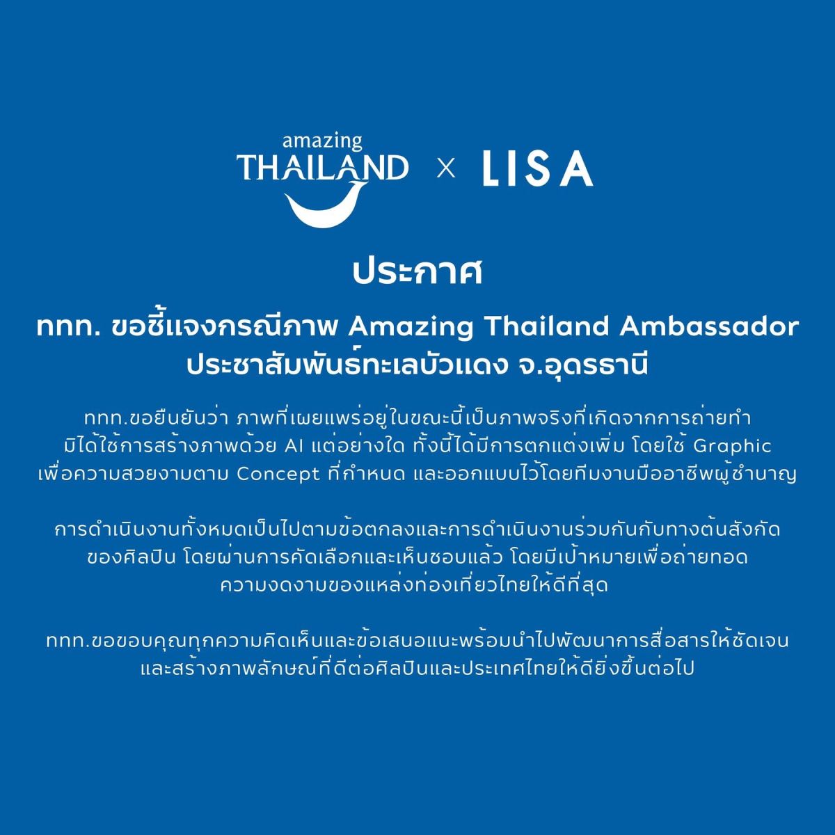 "ททท. ขอยืนยันว่า ภาพที่เผยแพร่อยู่ในขณะนี้เป็นภาพจริงที่เกิดจากการถ่ายทำ มิได้ใช้การสร้างภาพด้วย AI แต่อย่างใด ทั้งนี้ได้มีการตกแต่งเพิ่ม โดยใช้ Graphic เพื่อความสวยงามตาม Concept ที่กำหนด และออกแบบไว้โดยทีมงานมืออาชีพผู้ชำนาญ
