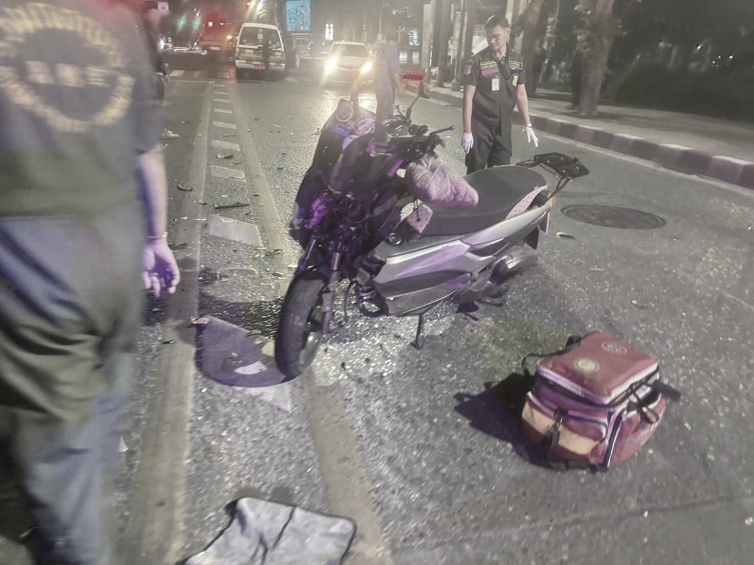ที่เกิดเหตุ พบรถจักรยานยนต์ ยามาฮ่า เอนแม็กซ์ สีเทา ป้ายทะเบียน กทม. ลักษณะชนกับ รถกระบะ โตโยต้า สีเทา ป้ายทะเบียน กทม ใกล้กันพบร่างของผู้บาดเจ็บ 1 ราย สวมเสื้อแจ๊กเก็ตไรเดอร์ มีอาการสาหัส ทางอาสา ม.ร่วมกตัญญู ดำเนินการช่วยเหลือ แต่ไม่เป็นผล เสียชีวิตในเวลาต่อมา ตรวจสอบเอกสาร เป็นหญิงไทย อายุ 31 ปี ในส่วนของสาเหตุอยู่ที่การสอบสวนของเจ้าหน้าที่ตำรวจ สน.ประชาชื่น