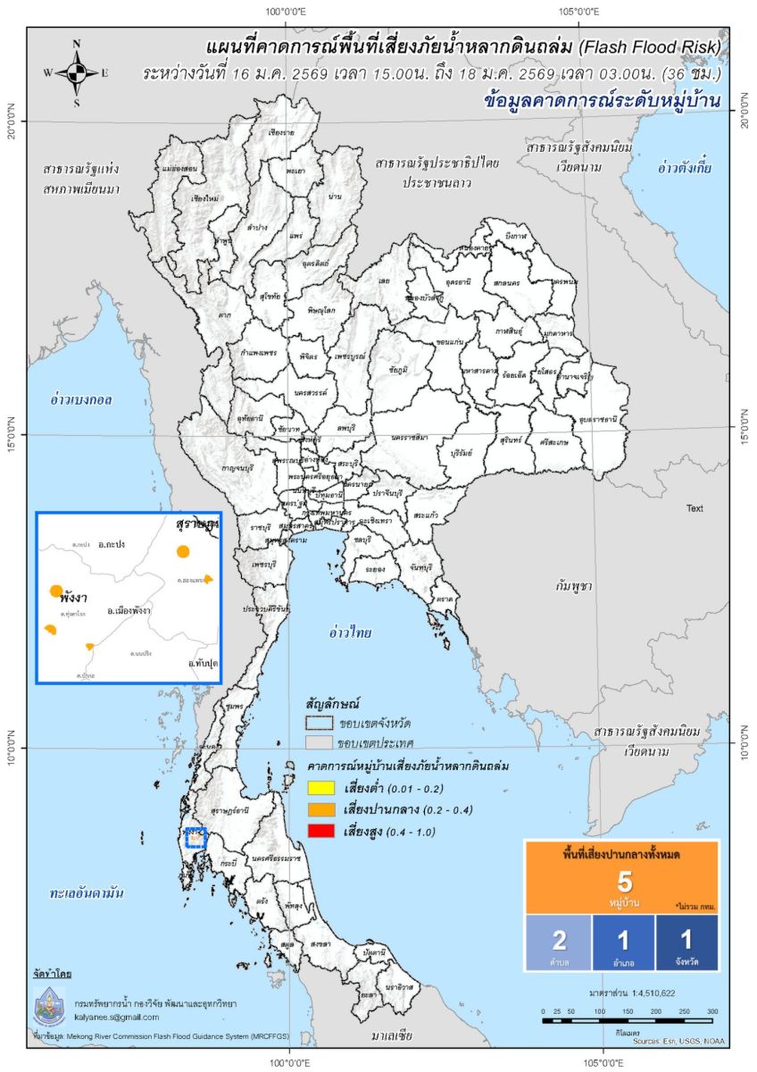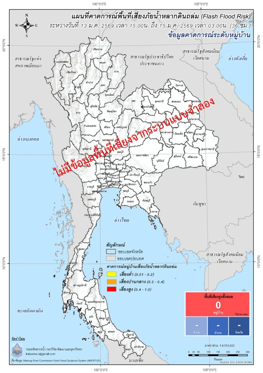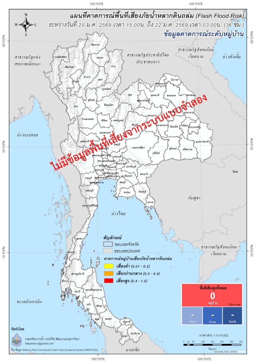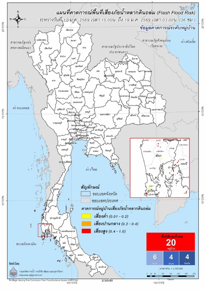แผนที่คาดการณ์พื้นที่เสี่ยงภัยน้ำหลากดินถล่ม (Flash Flood Risk Map) ระดับตำบล และระดับหมู่บ้าน วันที่ 7 - 24 ม.ค. 2569 *ผลการคาดการณ์จากระบบ Mekong River Commission Flash Flood Guidance System: MRCFFGS