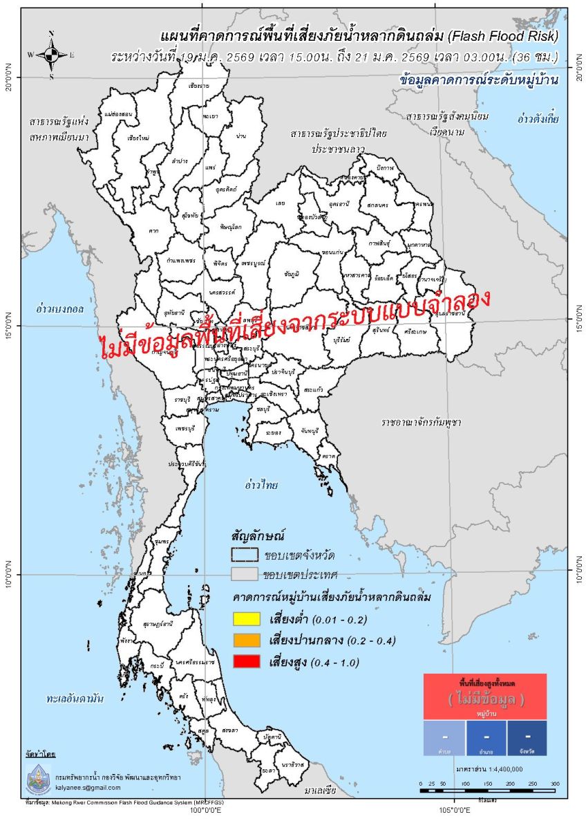 โดย กองวิจัย พัฒนาและอุทกวิทยา กรมทรัพยากรน้ำ ดำเนินการจัดทำข้อมูลคาดการณ์พื้นที่เสี่ยงภัยน้ำหลากดินถล่ม (Flash Flood Risk) ในระดับตำบล และระดับหมู่บ้าน ในห้วงเวลา 36 ชั่วโมงล่วงหน้า *ดาวน์โหลดข้อมูลจากระบบ MRCFFGS เวลา 15.00 น. ประจำวันได้ที่ Download แผนที่ และข้อมูล ได้ที่ link https://division.dwr.go.th/rdhd/index.php/th/services/12