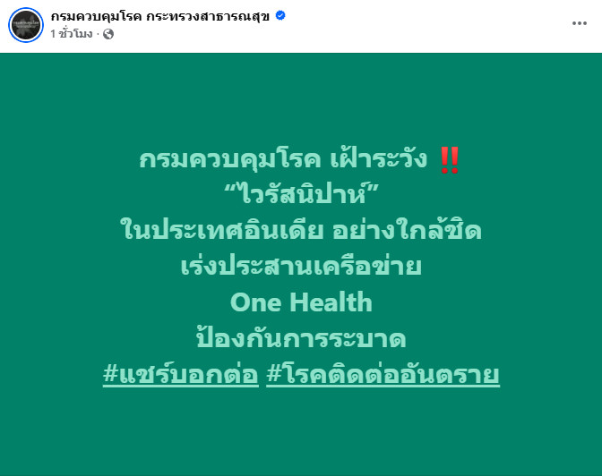 เพจเฟซบุ๊ก กรมควบคุมโรค กระทรวงสาธารณสุข ได้โพสต์ข้อความระบุว่า “กรมควบคุมโรค เฝ้าระวัง ‼ “ไวรัสนิปาห์” ในประเทศอินเดีย อย่างใกล้ชิด เร่งประสานเครือข่าย One Health ป้องกันการระบาด” โดยปัจจุบันยังไม่มีการพบผู้ป่วยในไทย