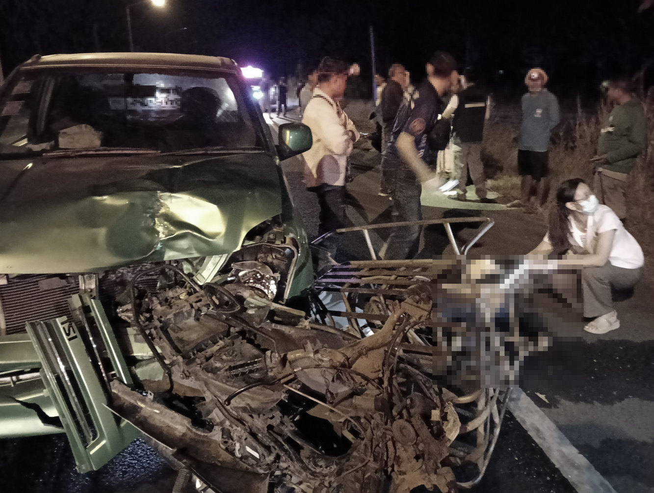 รถกระบะชนกับรถจักรยานยนต์พ่วงข้าง คุณลุงวัย 65 ปีเสียชีวิตกลางถนนสายสังขะ - ขอนแตก จ.สุรินทร์