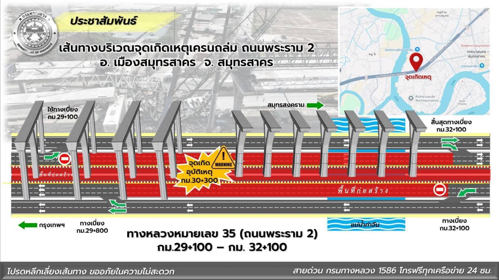 สถานการณ์ปัจจุบัน : เจ้าหน้าที่กำลังเร่งขนย้ายเศษปูนและโครงเหล็กจากอุบัติเหตุโครงการก่อสร้างฯ บริเวณสะพานท่าจีน ส่งผลให้ต้องปิดการจราจรทางหลักบางจุด ทำให้รถเคลื่อนตัวได้ช้าและมีท้ายแถวสะสม