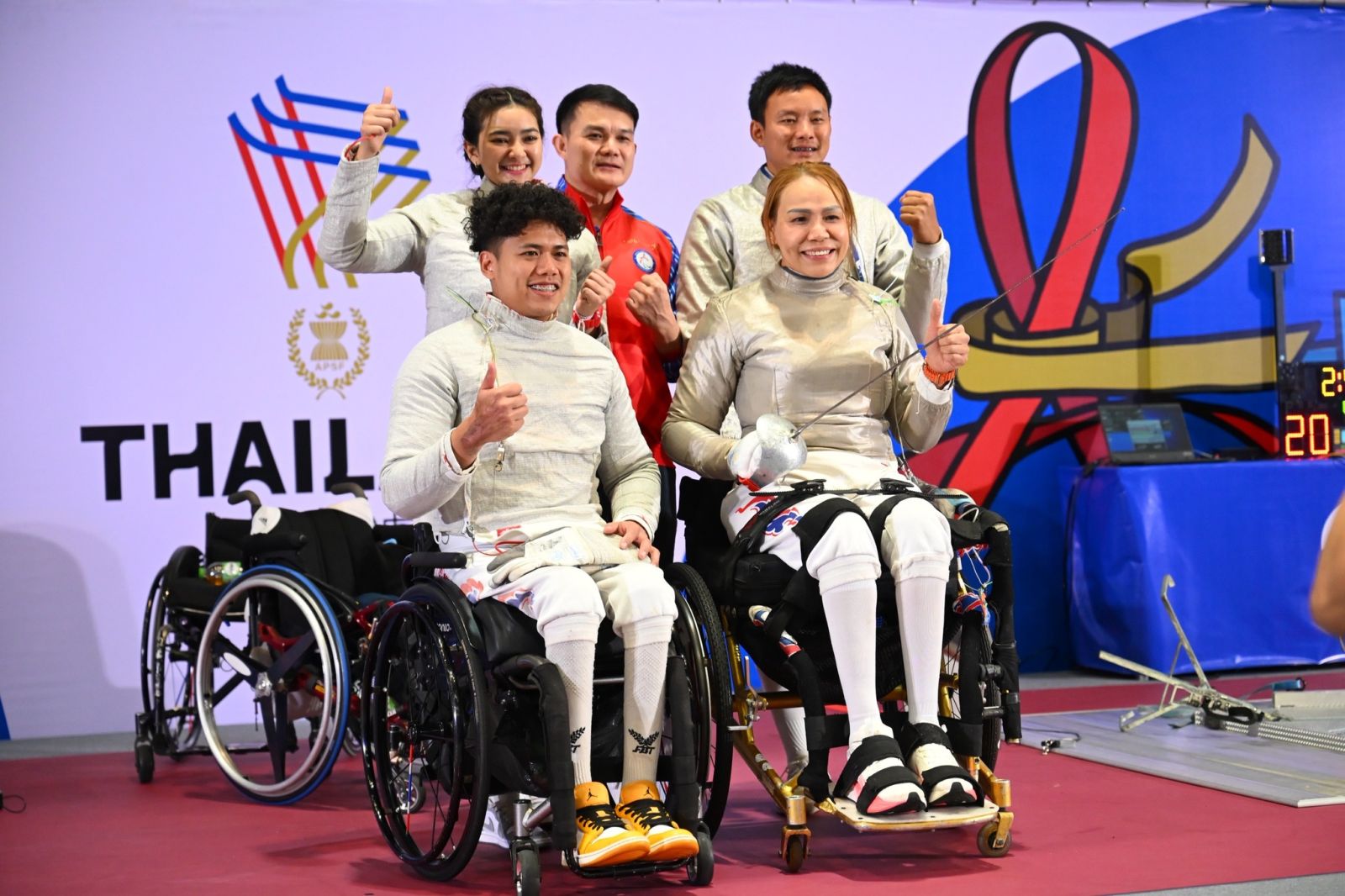 (ภาพ : ทีมวีลแชร์ฟันดาบ ประเภทเอเป้ ทีมผสม ทีมชาติไทย ขอบคุณภาพจาก กองประชาสัมพันธ์ กกท.)