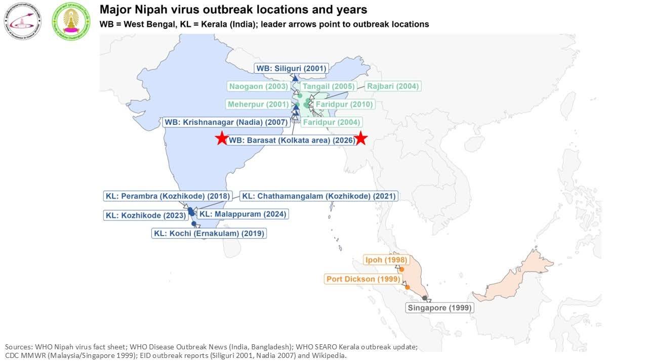 การระบาดของโรคนี้ จะพบในเอเชียตะวันออกเฉียงใต้ ไปจนถึงเอเชียใต้ เพราะมีตัวกลางเป็นค้างคาวกินผลไม้ ที่พบเชื้อได้ ดังแสดงในรูป
