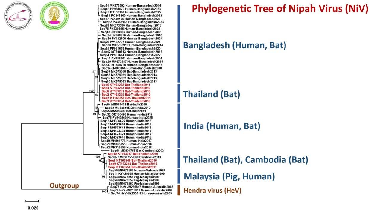 สายพันธุ์ที่พบที่เคยระบาดที่มาเลเซีย และสายพันธุ์ที่พบในเอเชียใต้ มีความแตกต่าง จึงทำให้มีลักษณะแตกต่างกัน ที่ระบาดที่อินเดียขณะนี้เป็นสายพันธุ์ของเอเชียใต้ ส่วนใหญ่จะติดต่อโดยตรงจากค้างคาว โดยการสัมผัส หรือรับประทาน น้ำตาลจากอินทผาลัม ที่ไม่ได้ต้ม ที่จริงก็คงคล้ายกับน้ำตาลสดที่เราได้จากต้นตาล หรือต้นมะพร้าว ก็เป็นข้อเตือนใจสำหรับคนไทย ที่จะรับประทานน้ำตาลสด ควรผ่านการต้มเสียก่อน ลักษณะสายพันธุ์ที่แตกต่างกันดังแสดงในรูป