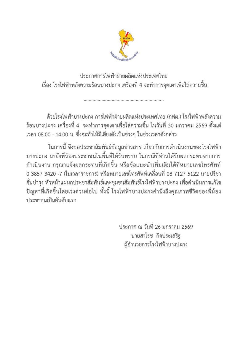 ด้วยโรงไฟฟ้าบางปะกง การไฟฟ้าฝ่ายผลิตแห่งประเทศไทย (กฟผ.) โรงไฟฟ้าพลังความร้อนบางปะกง เครื่องที่ 4 จะทำการจุดเตาเพื่อไล่ความชื้น ในวันที่ 30 มกราคม 2569 ตั้งแต่เวลา 08:00 - 14.00 น. ซึ่งจะทำให้มีเสียงดังเป็นช่วงๆ ในช่วงเวลาดังกล่าว