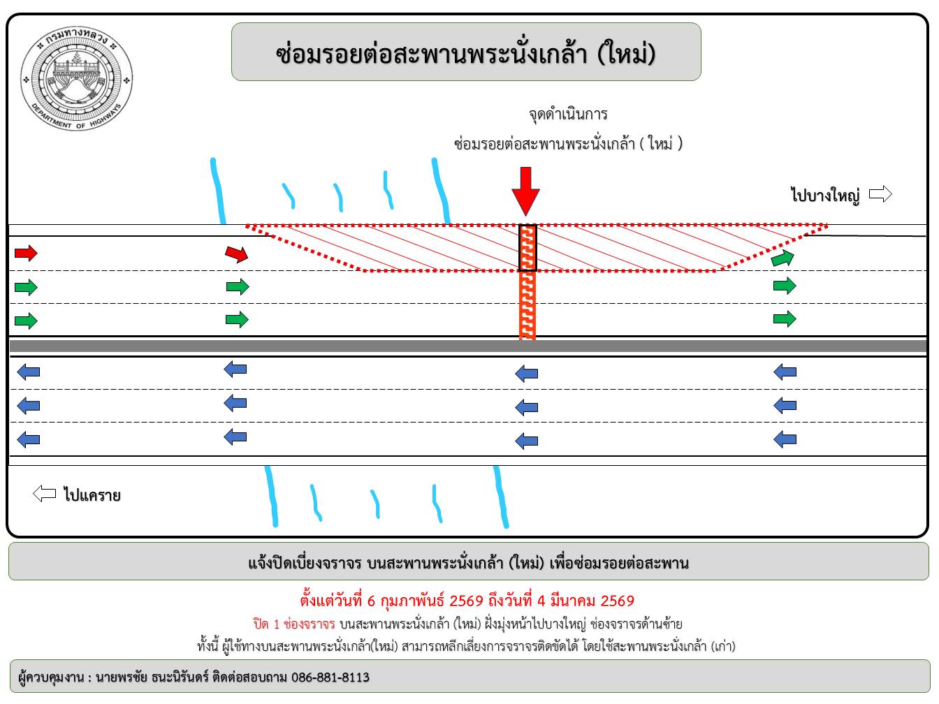 27 มกราคม 2569 แขวงทางหลวงนนทบุรี กรมทางหลวง ข่าวประชาสัมพันธ์ งานบำรุงรักษาสะพาน ถนนรัตนาธิเบศร์ ขาออก ตอนแยกพงษ์เพชร – สะพานพระนั่งเกล้า ที่ กม.11+489 ปริมาณงาน 1 แห่ง (สะพานพระนั่งเกล้าตัวใหม่ ฝั่งมุ่งหน้าไปบางใหญ่) ตั้งแต่วันที่ 6 กุมภาพันธ์ 2569 จนถึง 4 มีนาคม 2569 หลังปิดเบี่ยงเลนซ้าย ทำให้รถที่จะไปบางใหญ่ บางบัวทอง ช่องจราจรลดลงจาก 3 เหลือ 2 ช่องทางขวา อาจทำให้รถติดสะสมในบริเวณดังกล่าว ไม่ได้รับความสะดวก กรมทางหลวงต้องขออภัย ณ โอกาสนี้ แนะนำตรวจสอบการเดินทาง หรือ หลีกเลี่ยงจุดทำงานข้างต้น โดยใช้สะพานพระนั่งเกล้าเก่าแทนก็จะได้รับความสะดวก สอบถามข้อมูลเพิ่มเติม สายด่วนกรมทางหลวง 1586 (โทรฟรีทุกเครือข่ายตลอด 24 ชั่วโมง)