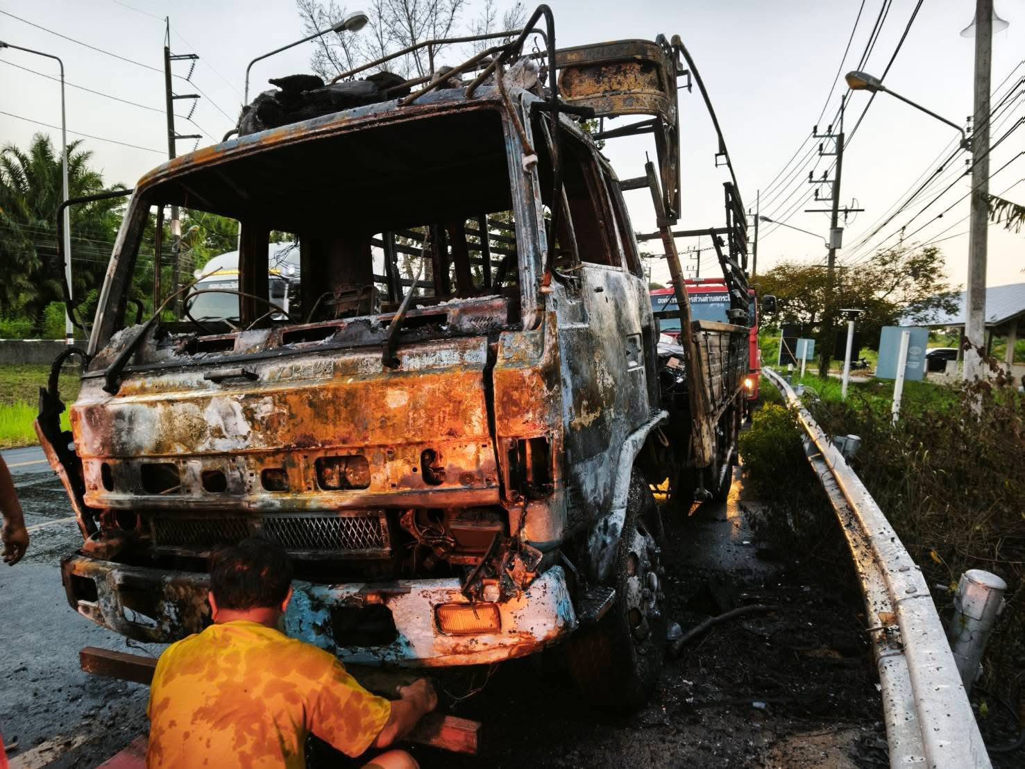 ไฟไหม้รถบรรทุก 6 ล้อ ลุกลามวอดทั้งคัน กลางถนนเพชรเกษม มั่งหน้าเข้าเมืองพังงา เคราะห์ดีไร้บาดเจ็บ จ.พังงา
