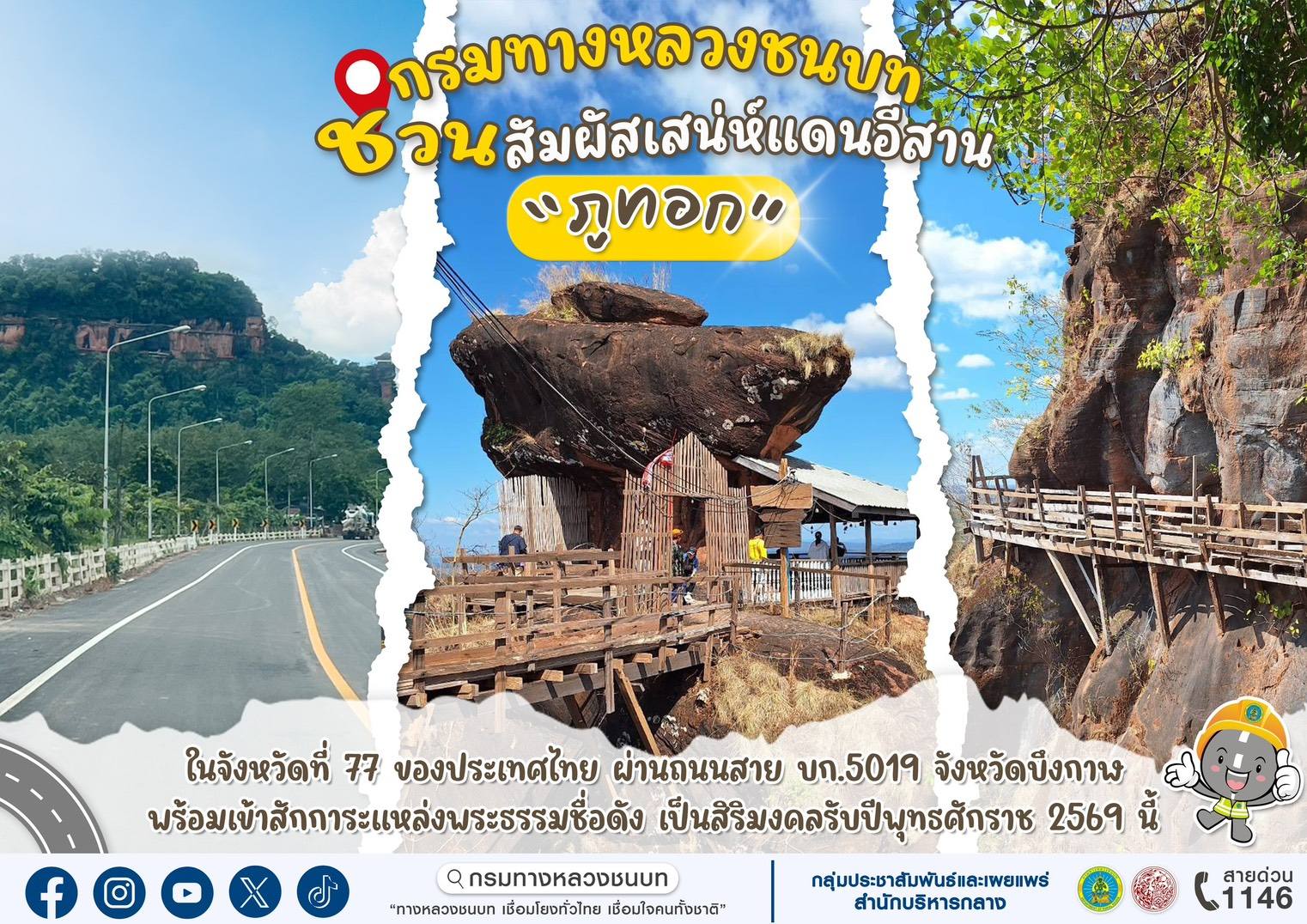 นายพิชิต หุ่นศิริ อธิบดีกรมทางหลวงชนบท เปิดเผยว่า กรมทางหลวงชนบท (ทช.) ขอเชิญชวนนักท่องเที่ยวเดินทางไปสัมผัสเสน่ห์แดนอีสานจังหวัดที่ 77 ของประเทศไทย ณ วัดเจติยาคีรีวิหาร หรือ วัดภูทอก แหล่งพระธรรมชื่อดัง เสริมสิริมงคลรับปีใหม่ พุทธศักราช 2569 ตลอดจนยลโฉมความงดงามทางธรรมชาติอย่างลงตัว ผ่านการเดินทางบนถนนทางหลวงชนบทสาย บก.5019 แยก ทช. บก.3009 - บ้านสันทรายงาม อำเภอเมืองศรีวิไล จังหวัดบึงกาฬ