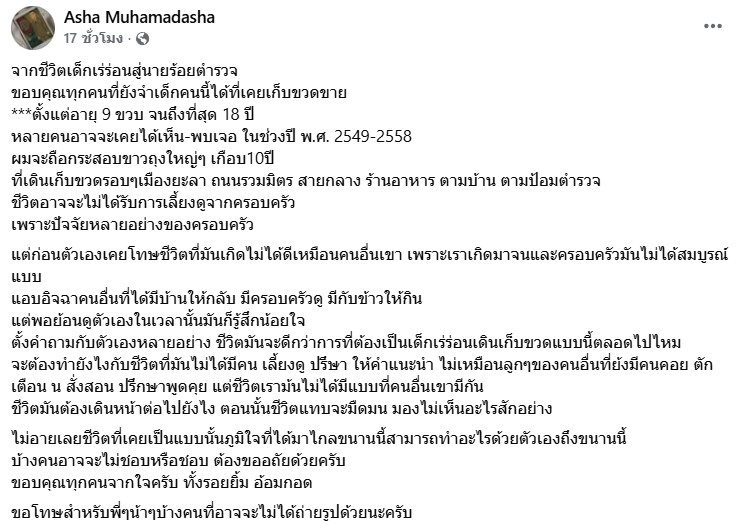 วันที่ 28 ม.ค.2569 มีเรื่องราวประทับใจที่ถูกแชร์ต่อในโซเชียล เป็นเรื่องราวจาก ร.ต.ท.นายหนึ่ง สู้ชีวิตจากเด็กเร่ร่อนสู่นายร้อยตำรวจ โดยเฟซบุ๊กของว่าที่ ร้อยตำรวจโท มูหามัดอัซฮา คำมงคล โพสต์ภาพพร้อมข้อความระบุว่า จากชีวิตเด็กเร่ร่อนสู่นายร้อยตำรวจ ขอบคุณทุกคนที่ยังจำเด็กคนนี้ได้ที่เคยเก็บขวดขาย