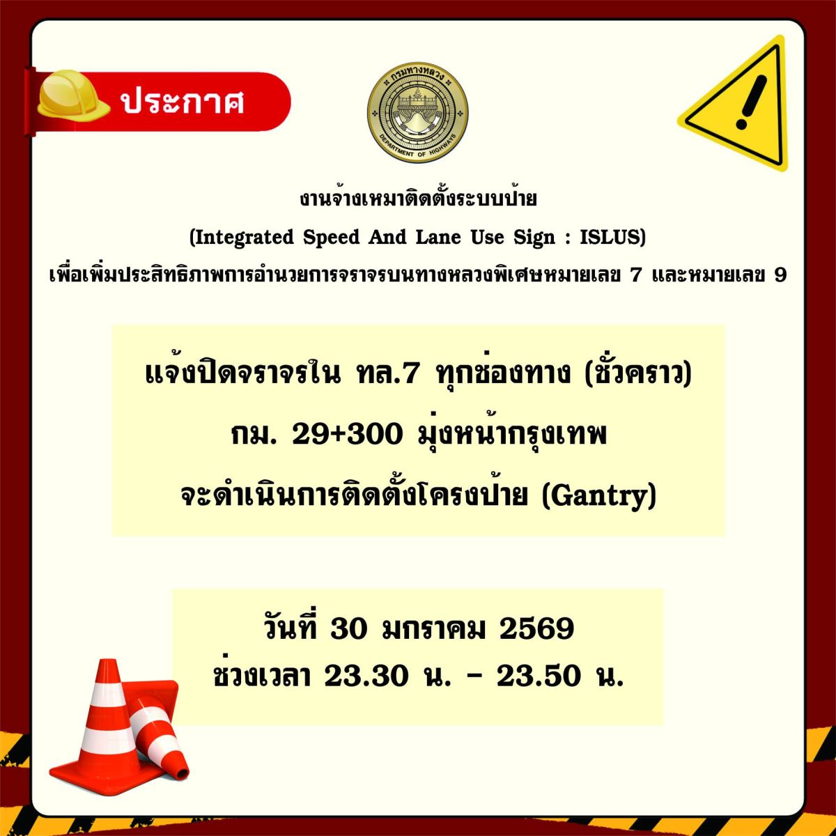 บนหลวงพิเศษหมายเลข 7 (กรุงเทพ - บ้านฉาง) ที่ กม.29+300 มุ่งหน้ากรุงเทพ จะดำเนินการติดตั้งโครงเหล็ก (Gantry) มีความจำเป็นต้องขอปิดการจราจรทุกช่องทาง(ชั่วคราว)