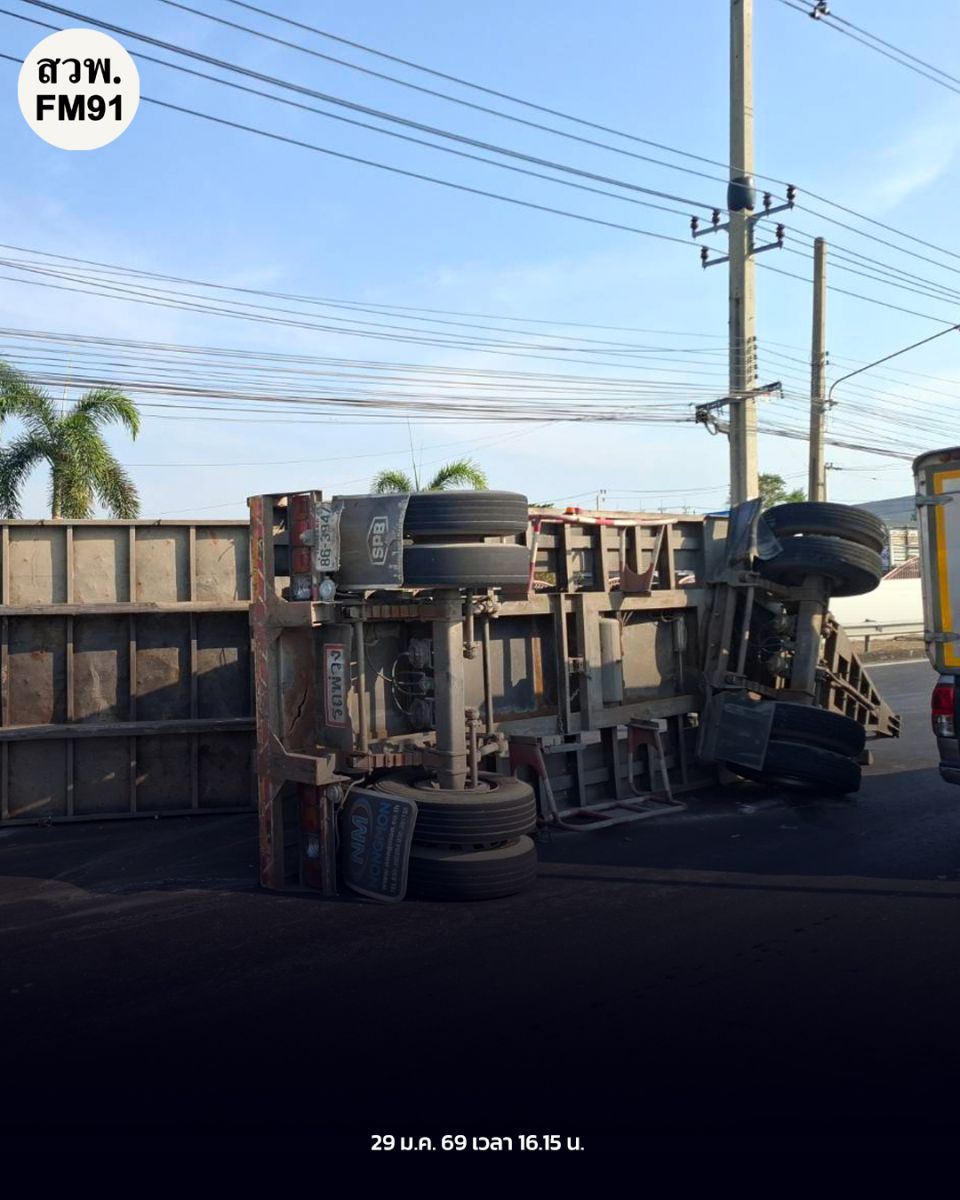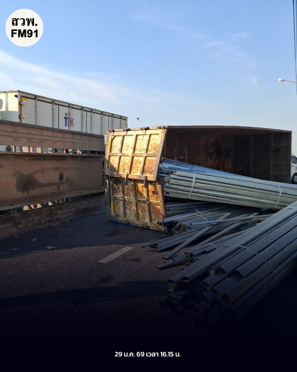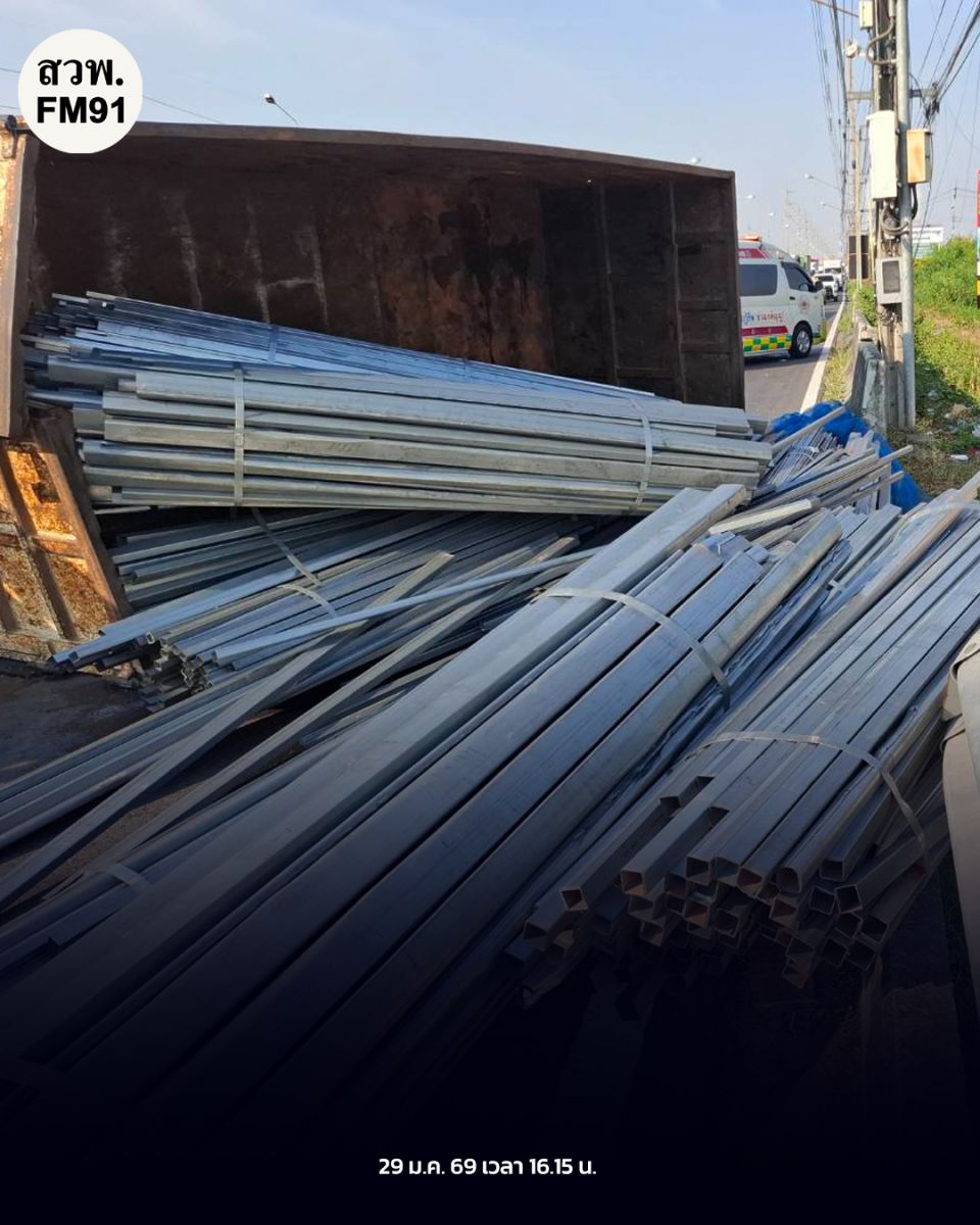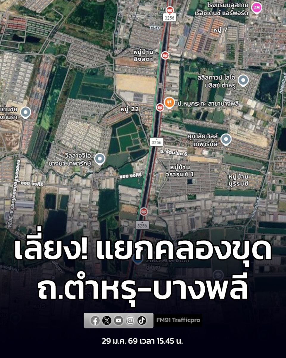 29 ม.ค. 69 เวลา 15.45 น. เลี่ยง! แยกคลองขุด ถ.ตำหรุ-บางพลี มุ่งหน้า แยกคลอง 9 กรณีรถพ่วงบรรทุกเหล็กพลิกตะแคง กีดขวางจราจร บริเวณจุดกลับรถ กม.7