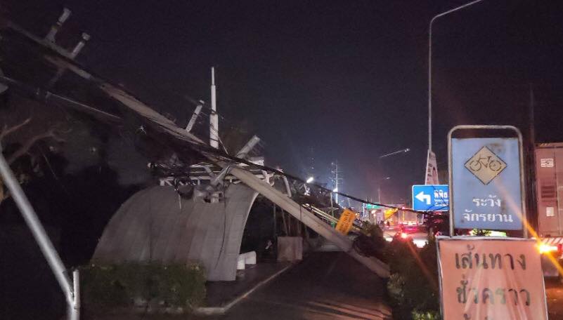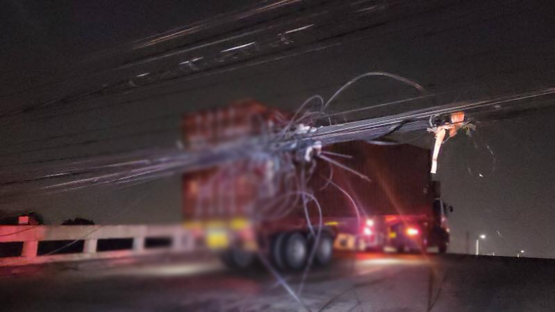 รถเทรลเลอร์เกี่ยวสายสื่อสาร รั้งเสาไฟล้มหลายสิบต้น ริมถนนสุขุมวิท บริเวณหน้าทางเข้า นิคมอุตสาหกรรมบางปูใหม่ ไฟฟ้าดับเป็นวงกว้าง จ.สมุทรปราการ