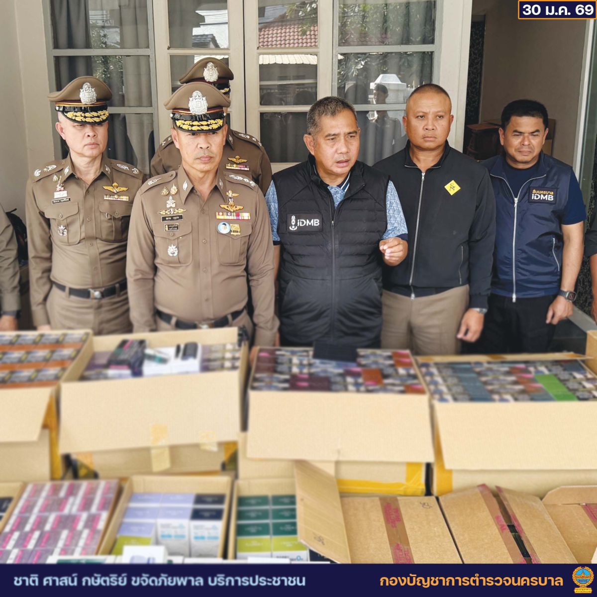 เวลา 13.30 น. วันนี้ (30 ม.ค.69 ) พล.ต.ท.สยาม บุญสม ผบช.น. พร้อมด้วย พล.ต.ต.เกียรติกุล สนธิเณร ผบก.น.2 และเจ้าหน้าที่ตำรวจที่เกี่ยวข้อง ร่วมแถลงผลการตรวจค้นและจับกุมผู้ต้องหา พร้อมยึดบุหรี่ได้จำนวนมาก ภายในซอยนวมินทร์ 74