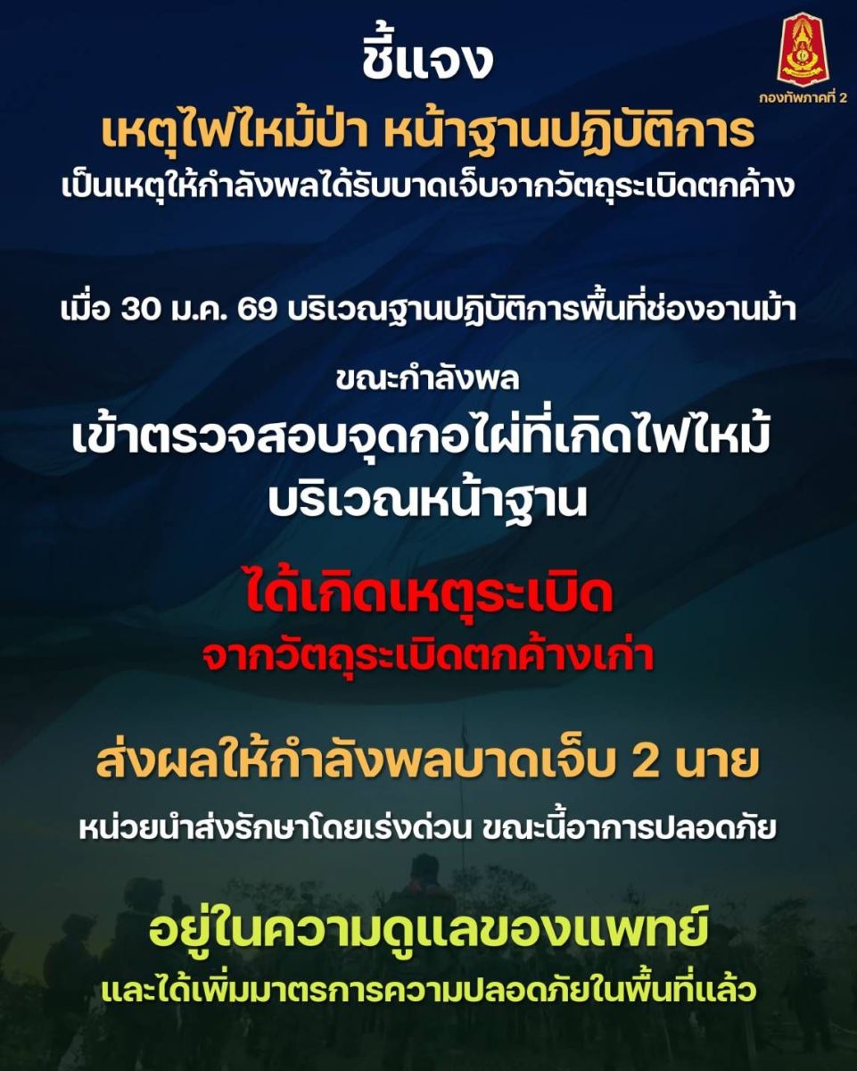 30 มกราคม 2569 กองทัพภาคที่ 2 ได้รับรายงานจากกำลังพลในพื้นที่ช่องอานม้า ว่าเกิดเหตุเพลิงไหม้หญ้าแห้งบริเวณหน้าแนวรั้วลวดหนาม จุดบ่อนไก่ ช่วงหน้าผา ซึ่งเป็นพื้นที่ที่เคยมีการสู้รบและมีลูกระเบิดตกค้างอยู่ก่อนหน้านี้