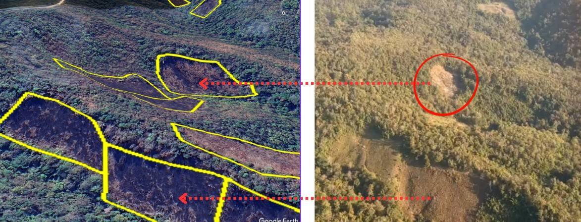 สำหรับ จุดที่ 2 บริเวณบ้านกิ่วหน่อ ตำบลเวียงเหนือ อำเภอปาย จังหวัดแม่ฮ่องสอน (พิกัด 47Q 453701 E 2159391 N) พบว่าเป็นจุดเดียวกับที่เกิดการแจ้งเตือน Hotspot เมื่อวันที่ 28 มกราคม 2569 ซึ่งเป็นการเผาเตรียมพื้นที่เกษตรในแปลงมาตรา 64 โดยไม่มีการขยายพื้นที่ออกนอกแปลง