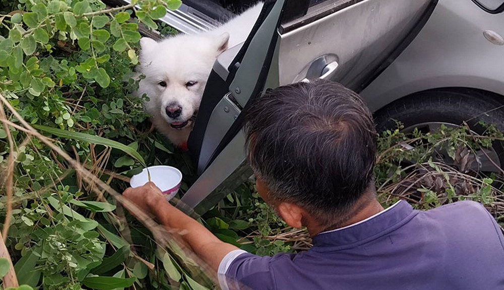 จากการสอบถามศิโรจน์ กมลพรวัฒนา อาสากู้ภัย กล่าวว่า มาถึงที่เกิดเหตุ พบว่าคนเจ็บ นั่งติดอยู่ตรงหน้าพวงมาลัยรถพยายามจะช่วยคนเจ็บออกเพื่อนำส่งโรงพยาบาลแต่ถูกสุนัขเห่าและขู่ไม่ยอมให้เข้าใกล้ จากนั้นพยายาม ไล่สุนัข ให้ออกจาก คนขับใช้เวลากว่า 15 นาทีจึงช่วยคนขับออกมาได้และนำส่งโรงพยาบาล กรุงสยามเซนต์คาร์ลอส และจะช่วยสุนัขออกมาจากรถ แต่น้องไม่ยอมออกทั้งเห่าทั้งเสียงขู่ เลยประสานไปทางญาติผู้ได้รับบาดเจ็บมารับสุนัขออกจากรถ ด้านเจ้าหน้าที่ตำรวจ สภ. เมืองปทุมธานี ตรวจสอบที่เกิดเหตุบันทึกภาพไว้เป็นหลักฐานและจะเรียกคนขับรถมาสอบถามเหตุการณ์ที่เกิดขึ้น ภายหลังและประสานรถยก เพื่อนำรถ ขึ้นจากริมถนนต่อไป