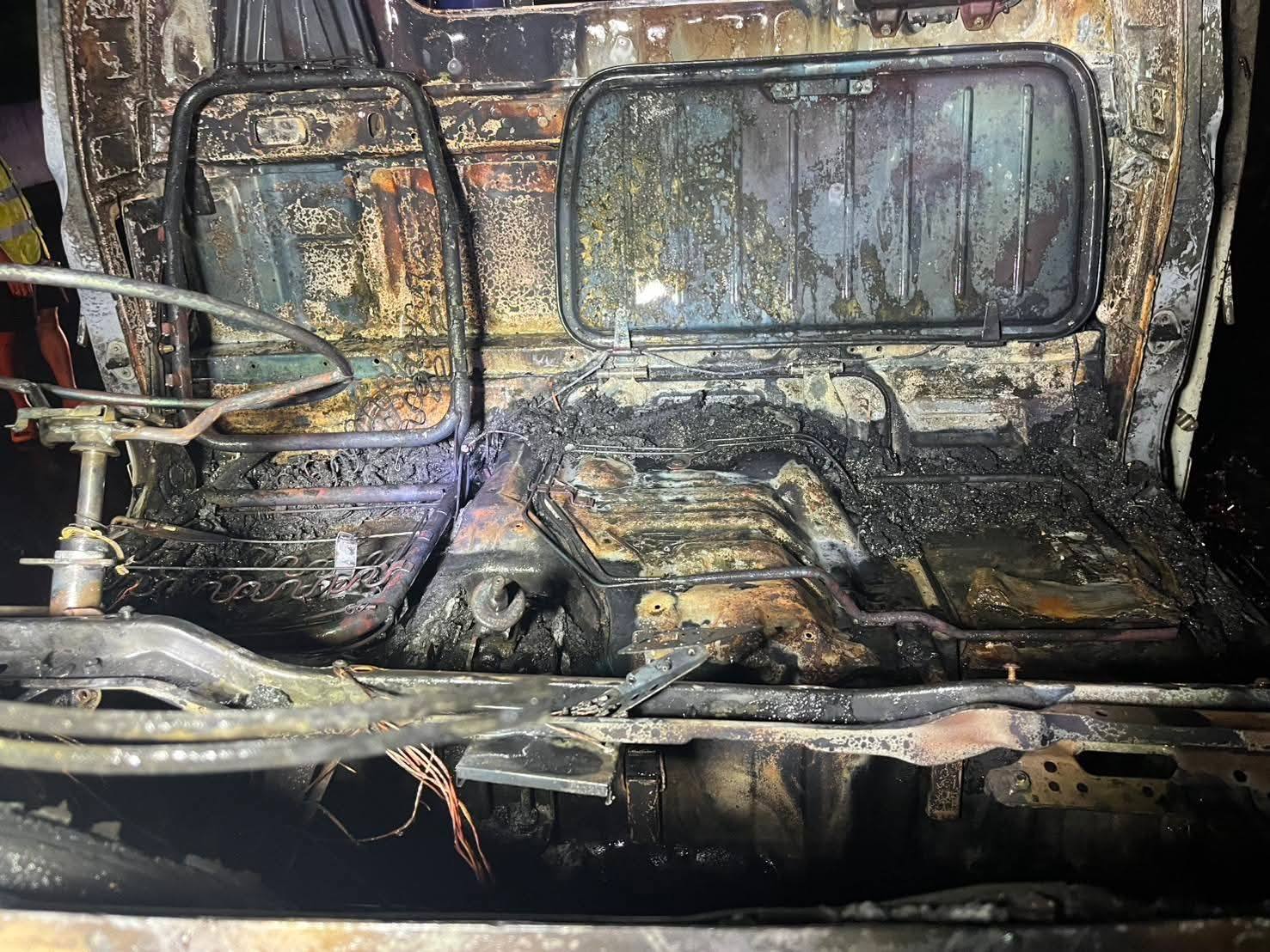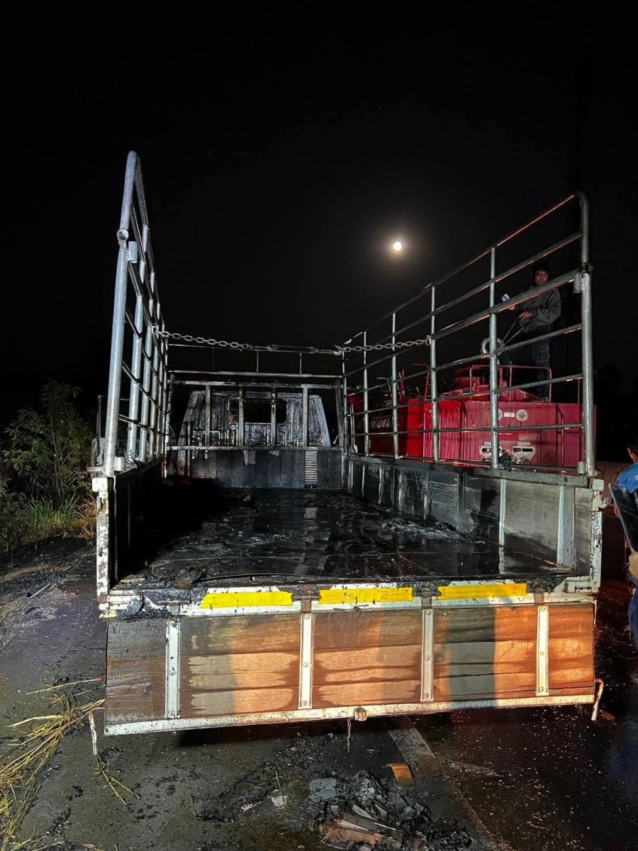 ที่เกิดเหตุ พบรถบรรทุก 6 ล้อ ป้ายทะเบียน ขอนแก่น สภาพรถพังเสียหาย และมีเพลิงลุกไหม้รุนแรง ทางเจ้าหน้าที่พร้อมด้วยรถดับเพลิง ระดมใช้หัวฉีดน้ำเข้าสกัดเพลิง จนสามารถควบคุมและเพลิงสงบลงในเวลาต่อมา