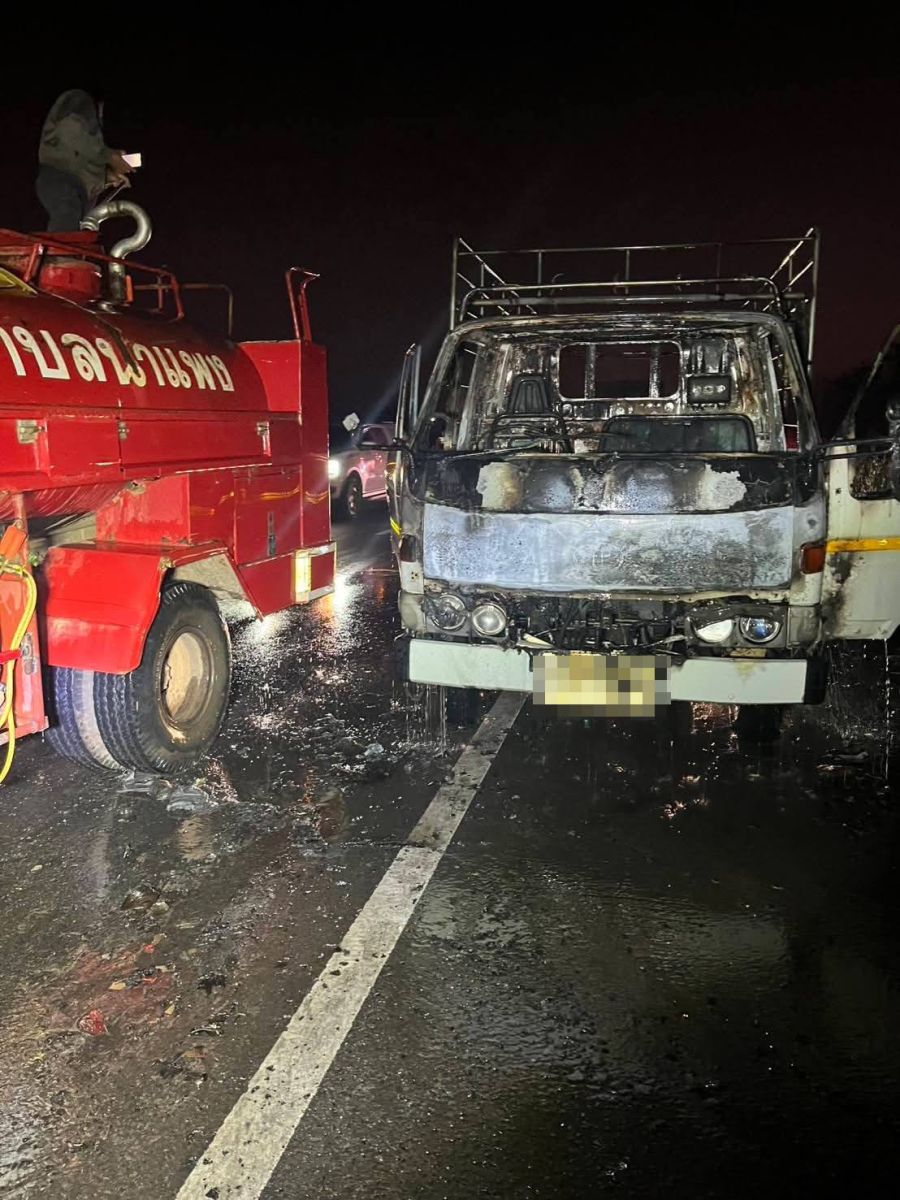 ไฟไหม้รถบรรทุก เสียหายเกือบทั้งคัน ริมถนนสายโคกโพธิ์ไชย - มัญจาคีรี จนท.พร้อมรถดับเพลิงระดมฉีดน้ำสกัดเพลิง จ.ขอนแก่น