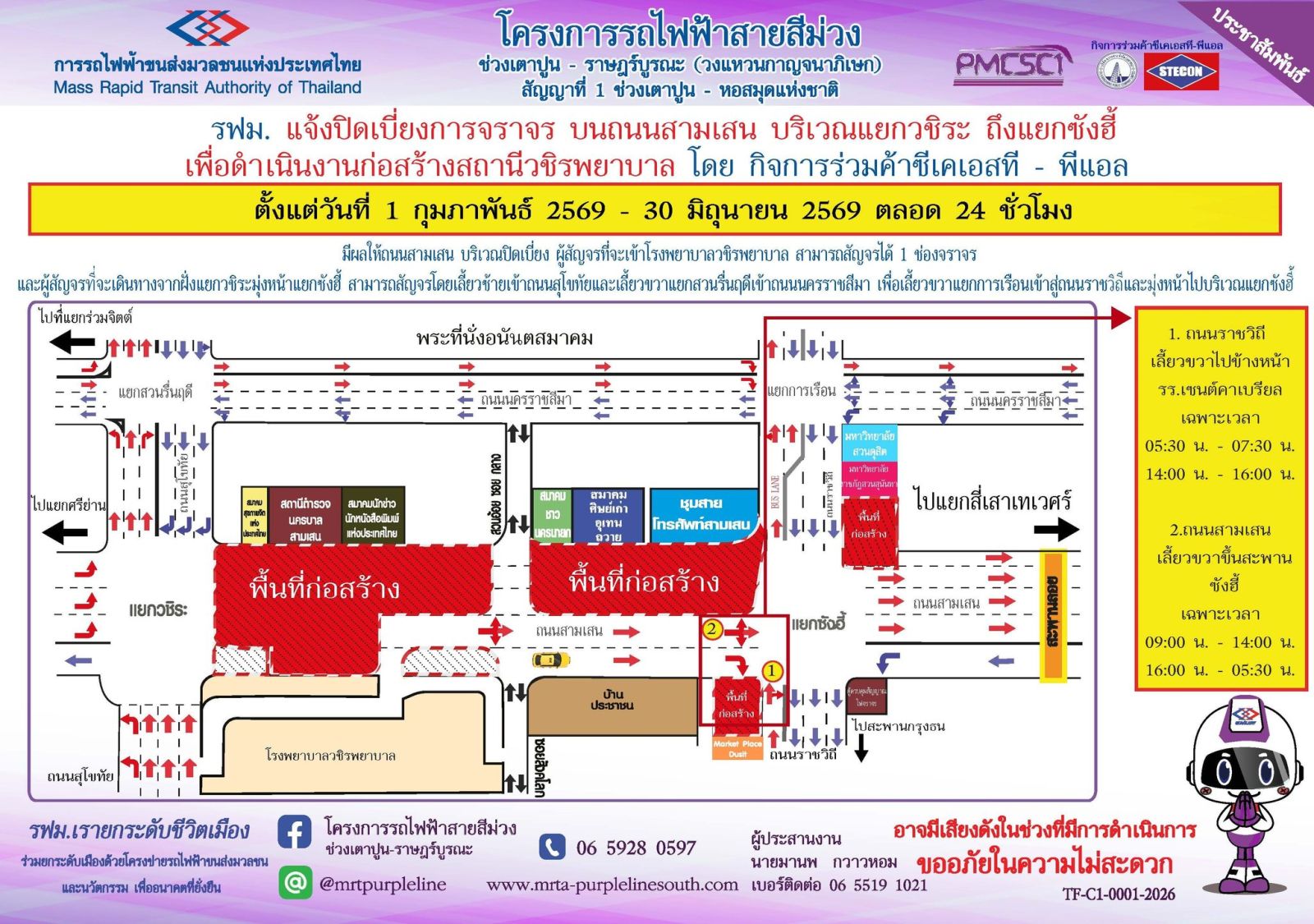 การรถไฟฟ้าขนส่งมวลชนแห่งประเทศไทย (รฟม.) แจ้งว่า กิจการร่วมค้า ซีเคเอสที-พีแอล ผู้รับจ้างออกแบบและก่อสร้างอุโมงค์ทางวิ่งและสถานีใต้ดิน โครงการรถไฟฟ้าสายสีม่วง ช่วงเตาปูน - ราษฎร์บูรณะ (วงแหวนกาญจนาภิเษก) สัญญาที่ 1 ช่วงเตาปูน - หอสมุดแห่งชาติ มีความจำเป็นต้องปิดเบี่ยงการจราจร บนถนนสามเสน บริเวณแยกวชิระ ถึง แยกซังฮี้ เพื่อดำเนินงานก่อสร้างสถานีวชิรพยาบาล ตั้งแต่วันที่ 1 กุมภาพันธ์ – 30 มิถุนายน 2569 ตลอด 24 ชั่วโมง มีผลให้ถนนสามเสน บริเวณปิดเบี่ยง ผู้สัญจรที่จะเข้าโรงพยาบาลวชิรพยาบาล สามารถสัญจรได้ 1 ช่องจราจร และผู้สัญจรที่จะเดินทางจากฝั่งแยกวชิระมุ่งหน้าแยกซังฮี้ สามารถสัญจรโดยเลี้ยวซ้ายเข้าถนนสุโขทัยและเลี้ยวขวาแยกสวนรื่นฤดีเข้าถนนนครราชสีมา เพื่อเลี้ยวขวาแยกการเรือนเข้าสู่ถนนราชวิถีและมุ่งหน้าไปบริเวณแยกซังฮี้ ทั้งนี้ ประชาชนสามารถเข้า-ออกที่พักอาศัยได้ตามปกติ