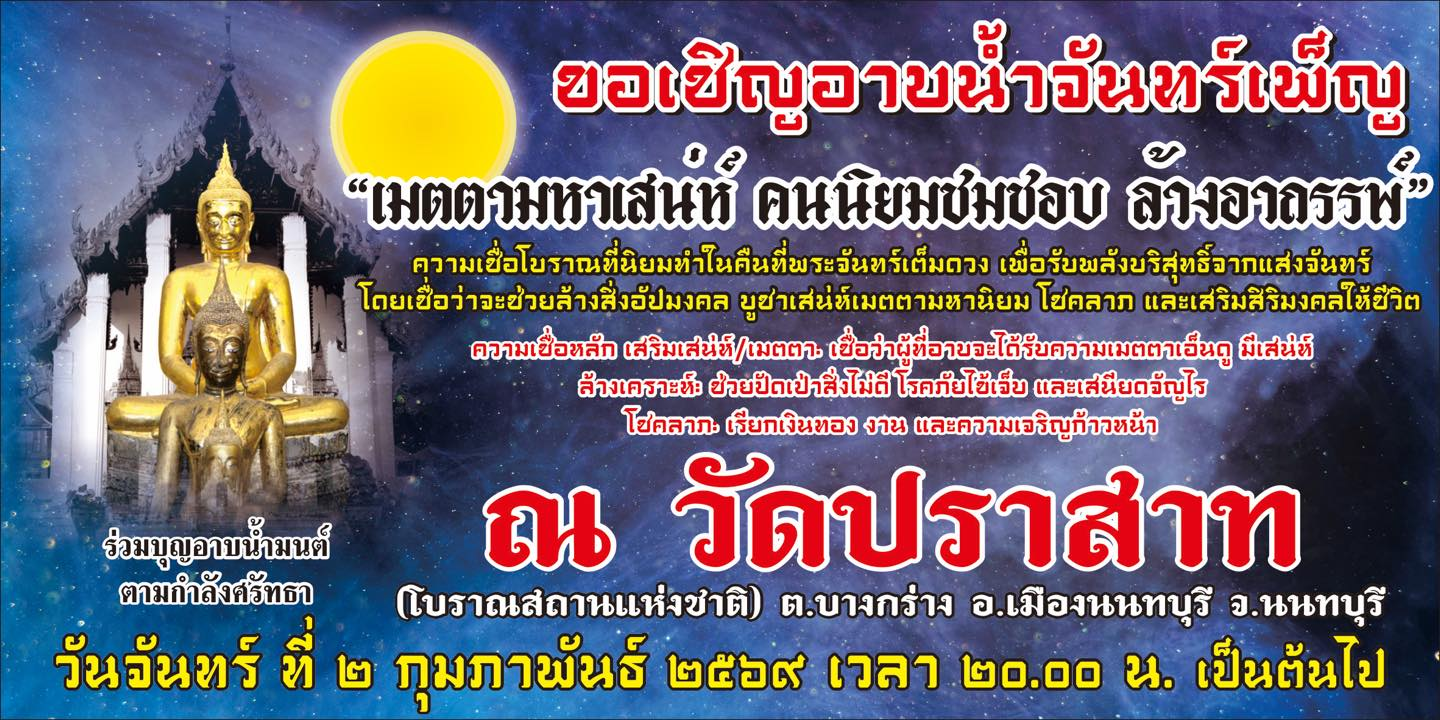 ที่จะผ่านหน้าวัดปราสาท อ.เมืองนนทบุรี จ.นนทบุรี มีการอาบน้ำจันทร์เพ็ญ เริ่มเวลา 20.00 น. เป็นต้นไป