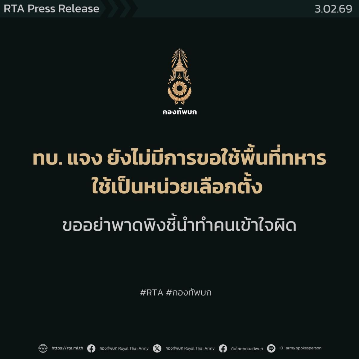 ขอเรียนว่า ปัจจุบันยังไม่มีการขอใช้พื้นที่ภายในหน่วยทหารใช้เป็นหน่วยลงคะแนนเลือกตั้ง การกล่าวถึงในลักษณะดังกล่าว จึงเป็นการกล่าวหาเกินความเป็นจริง
