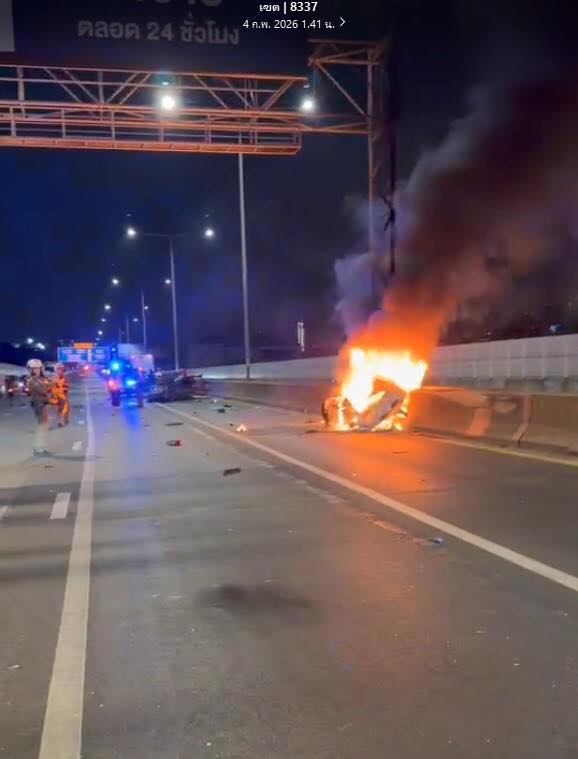 เวลา 00.35 น. วันที่ 4 กุมภาพันธ์ 2569 รับแจ้งว่า เกิดอุบัติเหตุและมีเพลิงไหม้รถยนต์ บนทางพิเศษด่วนศรีรัช ฝั่งขาออกมุ่งหน้าแจ้งวัฒนะ เลยทางขึ้นยมราช ช่วงเหนือ รพ.รามาฯ