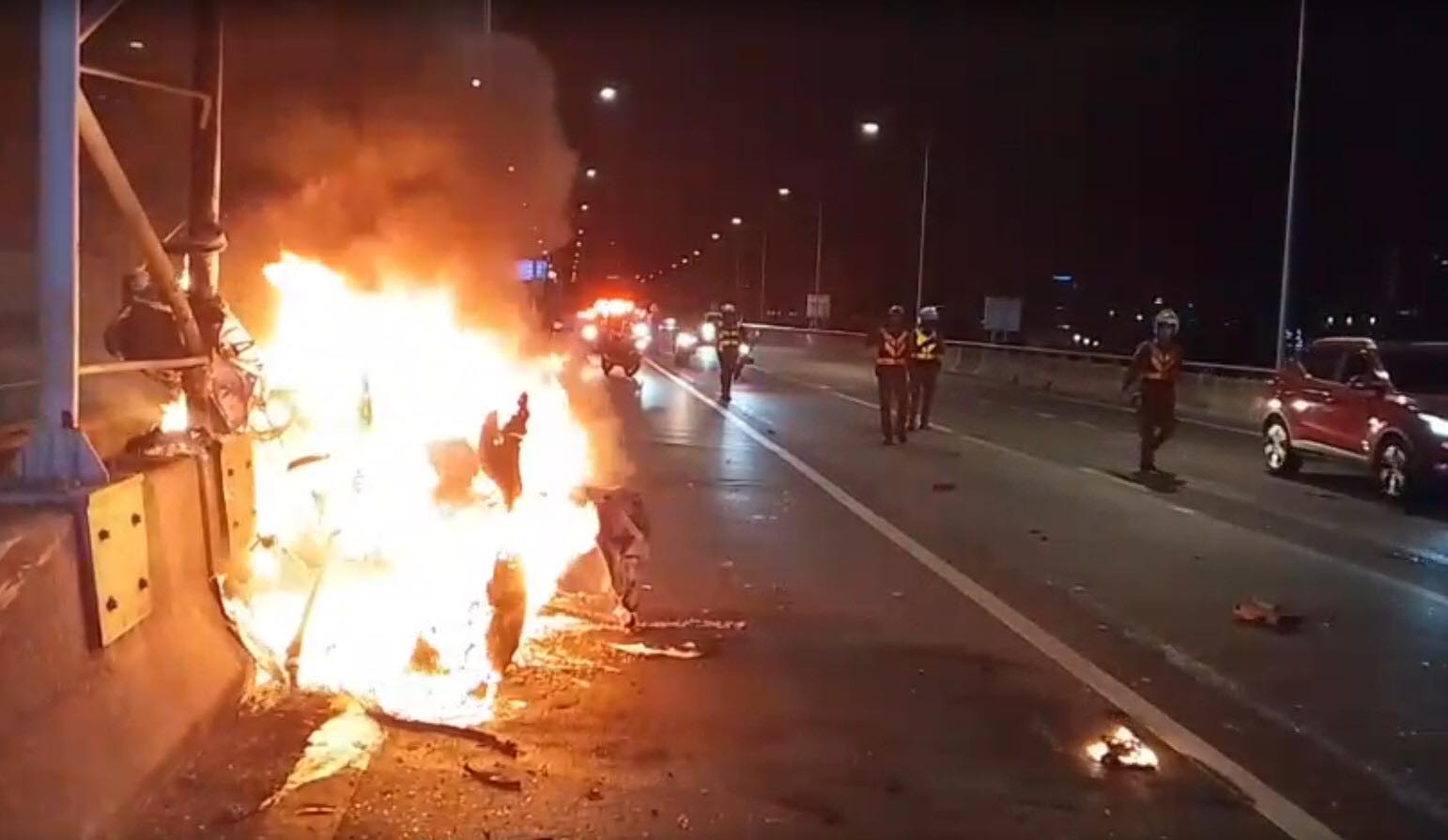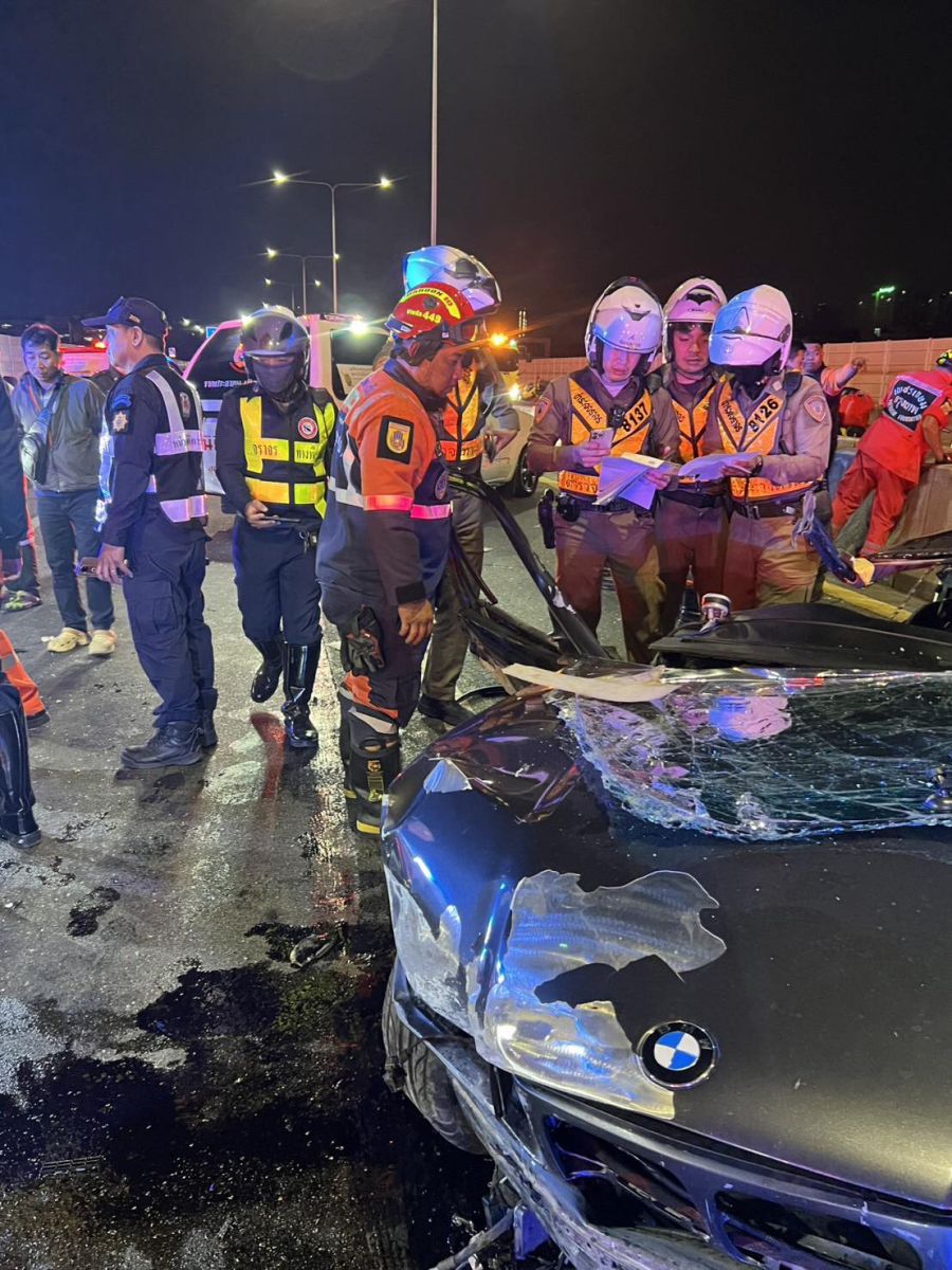 รถเก๋งยี่ห้อหรูเฉี่ยวชนกับรถแท็กซี่ ก่อนเสียหลักฟาดขอบทาง บนทางพิเศษศรีรัช สภาพรถขาดครึ่งแล้วเกิดเพลิงไหม้ จนท.เร่งช่วยเหลือผู้บาดเจ็บ 2 รายนำส่ง รพ.