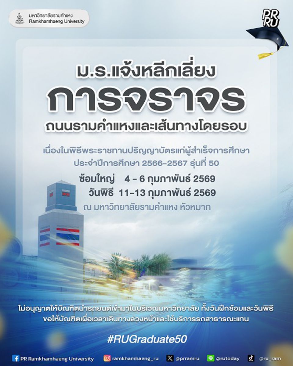 มหาวิทยาลัยรามคำแหง แจ้งหลีกเลี่ยงถนนรามคำแหง และเส้นทางโดยรอบถนนรามคำแหง เนื่องจากจะมีการซ้อมใหญ่ วันที่ 4 – 6 กุมภาพันธ์ 2569