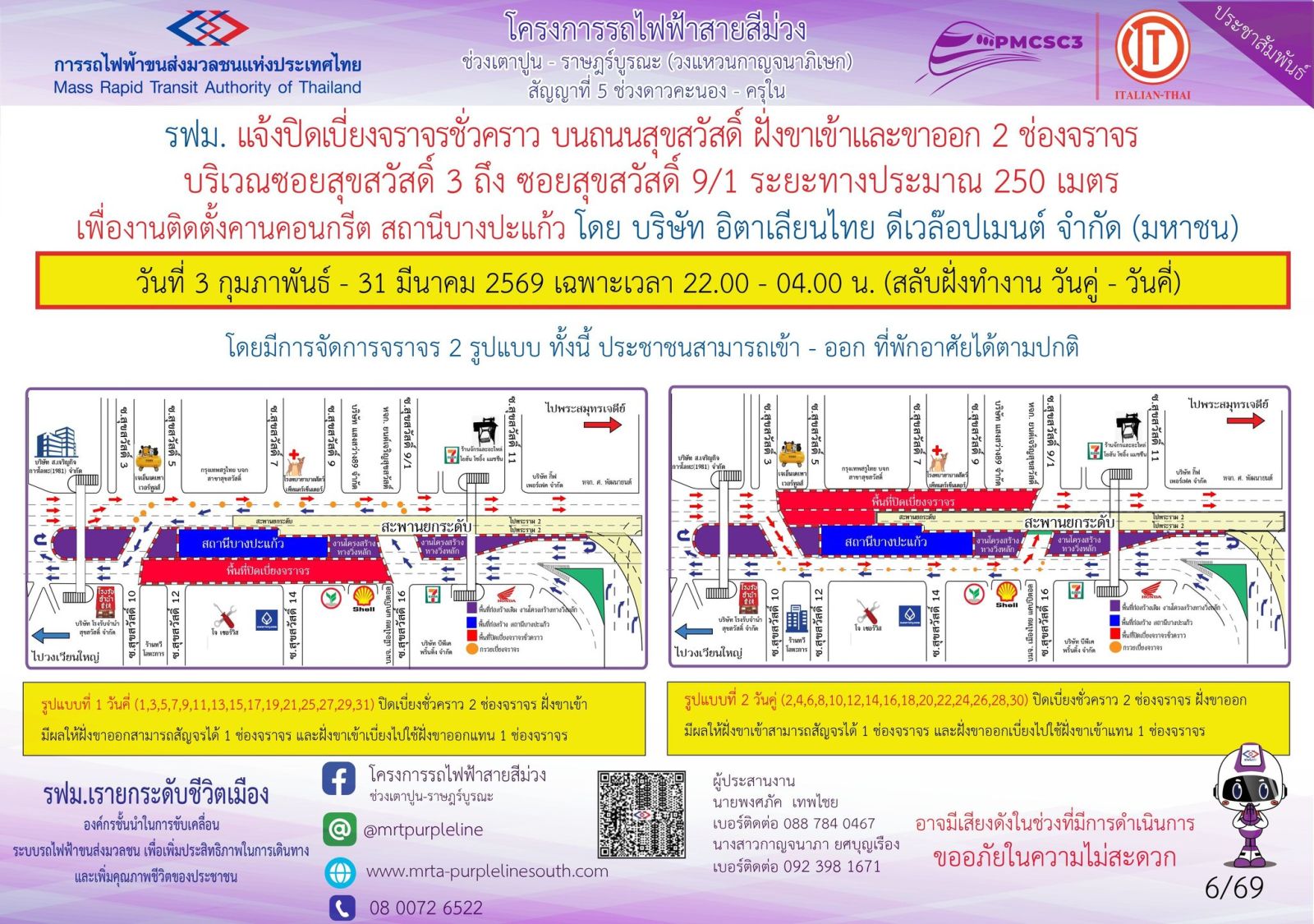 การรถไฟฟ้าขนส่งมวลชนแห่งประเทศไทย (รฟม.) แจ้งว่า บริษัท อิตาเลียนไทย ดีเวล๊อปเมนต์ จำกัด (มหาชน) ผู้รับจ้างงานก่อสร้างทางวิ่งและสถานียกระดับ อาคารจอดรถไฟฟ้าและอาคารจอดแล้วจร โครงการรถไฟฟ้าสายสีม่วง ช่วงเตาปูน - ราษฎร์บูรณะ (วงแหวนกาญจนาภิเษก) สัญญาที่ 5 ช่วงดาวคะนอง - ครุใน มีความจำเป็นต้องปิดเบี่ยงจราจรชั่วคราว บนถนนสุขสวัสดิ์ ฝั่งขาเข้าและขาออก 2 ช่องจราจร บริเวณซอยสุขสวัสดิ์ 3 ถึง ซอยสุขสวัสดิ์ 9/1 ระยะทางประมาณ 250 เมตร เพื่องานติดตั้งคานคอนกรีต สถานีบางปะแก้ว ในวันที่ 3 กุมภาพันธ์ - 31 มีนาคม 2569 เฉพาะเวลา 22.00 - 04.00 น. (สลับฝั่งทำงานวันคู่-วันคี่) โดยมีการจัดการจราจร 2 รูปแบบ ทั้งนี้ ประชาชนสามารถเข้า-ออก ที่พักอาศัยได้ตามปกติ