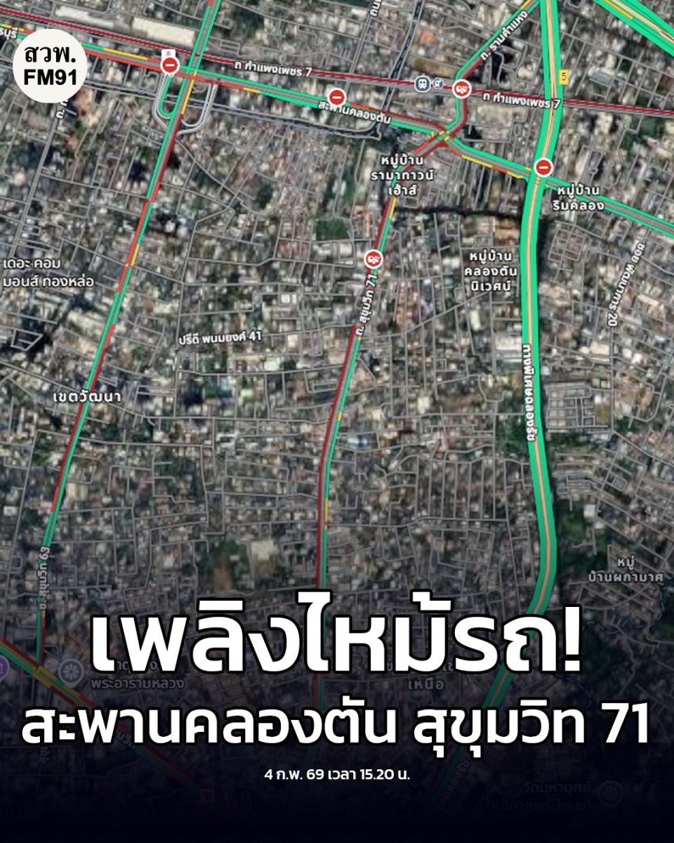 เวลา 15.20 น. จากเหตุเพลิงไหม้รถยนต์ สะพานคลองตัน ถ.สุขุมวิท 71 ปากซอยปรีดีพนมยงค์ 45 จนท. ควบคุมเพลิงไว้ได้ อยู่ระหว่างเคลื่อนย้าย ท้ายอยู่ปากซอยปรีดีพนมยงค์ 9