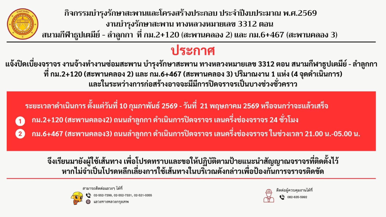 สภ.คูคต - แขวงทางหลวงกรุงเทพ แจ้งปชส. เนื่องจากแขวงทางหลวงกรุงเทพจะดำเนินการซ่อมแซมสะพานคลอง 2 และคลอง 3 บนถนนลำลูกกา รวม 2 จุด