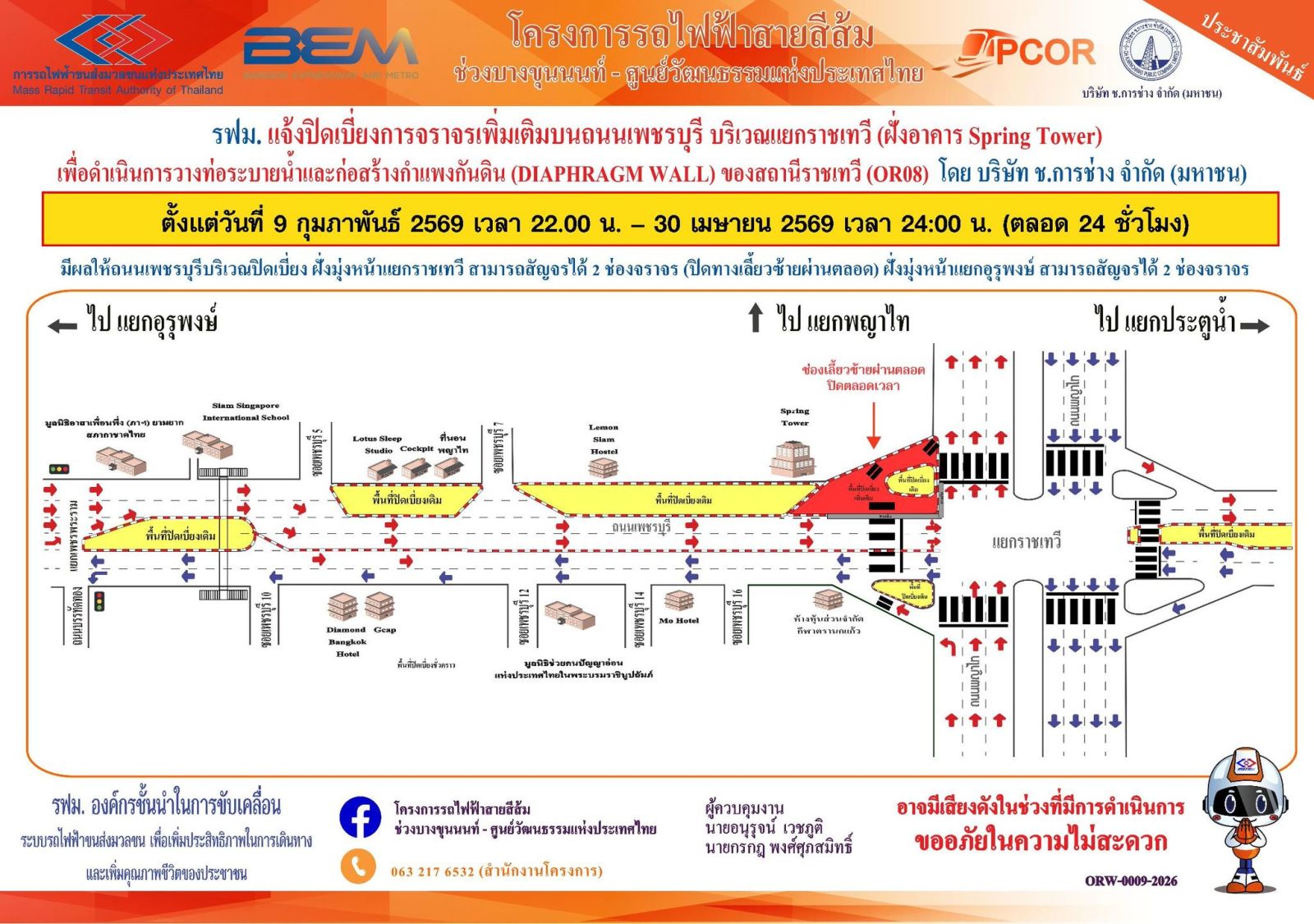 การรถไฟฟ้าขนส่งมวลชนแห่งประเทศไทย (รฟม.) แจ้งว่า บริษัท ช.การช่าง จำกัด (มหาชน) ผู้รับจ้างออกแบบและก่อสร้างอุโมงค์ทางวิ่งและสถานีใต้ดิน โครงการรถไฟฟ้าสายสีส้ม ช่วงบางขุนนนท์ – ศูนย์วัฒนธรรมแห่งประเทศไทย มีความจำเป็นต้องปิดเบี่ยงการจราจรเพิ่มเติม 2 ช่องจราจร บนถนนเพชรบุรี บริเวณแยกราชเทวี (ฝั่งอาคาร Spring Tower) เพื่อดำเนินงานวางท่อระบายน้ำและก่อสร้างกำแพงกันดิน (DIAPHRAGM WALL) สถานีราชเทวี (OR08) ตั้งแต่วันที่ 9 กุมภาพันธ์ 2569 เวลา 22.00 น. – 30 เมษายน 2569 เวลา 24.00 น. (ตลอด 24 ชั่วโมง) มีผลให้ถนนเพชรบุรีบริเวณปิดเบี่ยง ฝั่งมุ่งหน้าแยกราชเทวี และฝั่งมุ่งหน้าแยกอุรุพงษ์ สามารถสัญจรได้ฝั่งละ2 ช่องจราจร โดยประชาชนสามารถเข้า – ออกที่พักอาศัยได้ตามปกติ