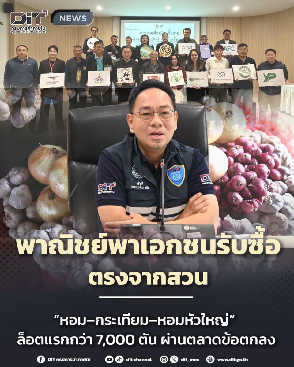 กรมการค้าภายใน กระทรวงพาณิชย์ เดินหน้าเชื่อมโยงการซื้อขายพืชเศรษฐกิจสำคัญ 3 หัว ได้แก่ หอมแดง กระเทียม และหอมหัวใหญ่ ผ่านกลไก “ตลาดข้อตกลง” พาเอกชนรับซื้อตรงจากสวน ดูดซับผลผลิตรวมกว่า 7,075 ตัน มูลค่ากว่า 108 ล้านบาท ซึ่งเป็นการเชื่อมโยงซื้อขายล็อตแรกของฤดูการผลิตปี 2568/69 เพื่อกระจายผลผลิตจากแหล่งผลิตสู่ตลาดในประเทศและการแปรรูป ช่วยรักษาเสถียรภาพราคาและสร้างรายได้ที่เหมาะสมให้เกษตรกร