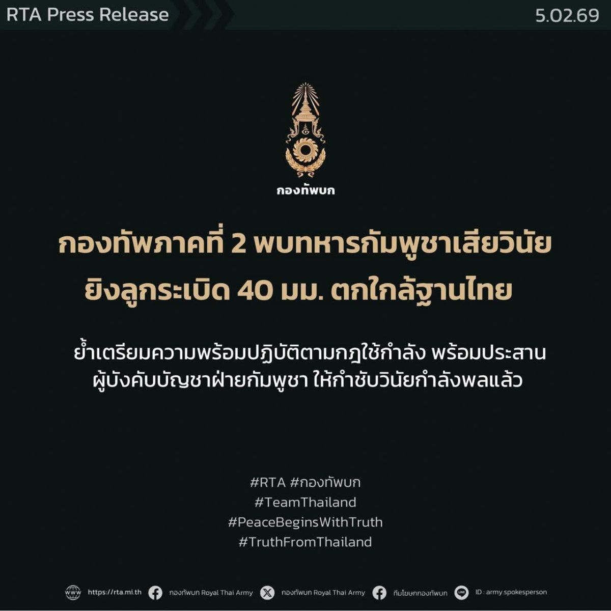 วันที่ 5 กุมภาพันธ์ กองทัพภาคที่ 2 รายงานว่า เมื่อเวลาประมาณ 10.20 น. วันนี้ (5กพ.69) พบการยิงลูกระเบิดขนาด 40 มม. ตกใกล้ฐานปฏิบัติการฝ่ายไทย ในพื้นที่ อ.กันทรลักษ์ จ.ศรีสะเกษ โดยไม่มีกำลังพลได้รับบาดเจ็บ ซึ่งหลังเกิดเหตุฝ่ายไทยได้เตรียมรับสถานการณ์ และเตรียมปฏิบัติตามกฎการใช้กำลัง